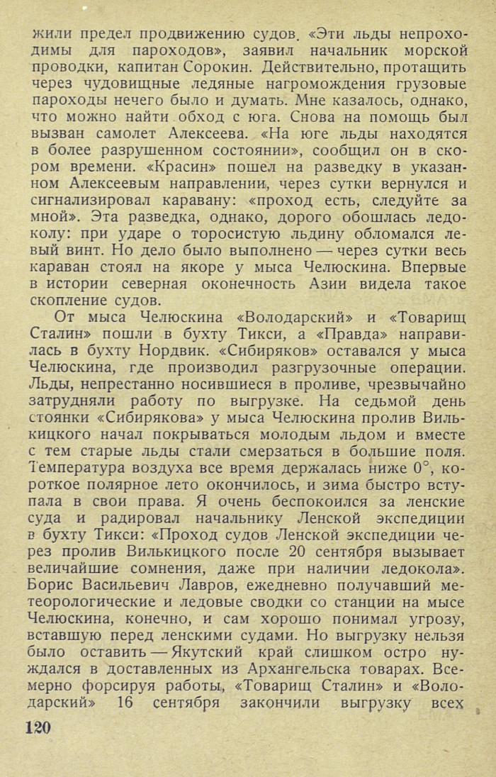 От мыса Челюскина «Володарский» и «Товарищ Сталин» пошли в бухту Тикси, а «Правда» направилась в бухту Нордвик. «Сибиряков» оставался у мыса Челюскина, где производил разгрузочные операции. Льды, непрестанно носившиеся в проливе, чрезвычайно затрудняли работу по выгрузке. На седьмой день стоянки «Сибирякова» у мыса Челюскина пролив Вилькицкого начал покрываться молодым льдом и вместе с тем старые льды стали смерзаться в большие поля. Температура воздуха все время держалась ниже 0°, короткое полярное лето окончилось, и зима быстро вступала в свои права. Я очень беспокоился за ленские суда и радировал начальнику Ленской экспедиции в бухту Тикси: «Проход судов Ленской экспедиции через пролив Вилькицкого после 20 сентября вызывает величайшие сомнения, даже при наличии ледокола». Борис Васильевич Лавров, ежедневно получавший метеорологические и ледовые сводки со станции на мысе Челюскина, конечно, и сам хорошо понимал угрозу, вставшую перед ленскими судами. Но выгрузку нельзя было оставить — Якутский край слишком остро нуждался в доставленных из Архангельска товарах. Всемерно форсируя работы, «Товарищ Сталин» и «Володарский» 16 сентября закончили выгрузку всех