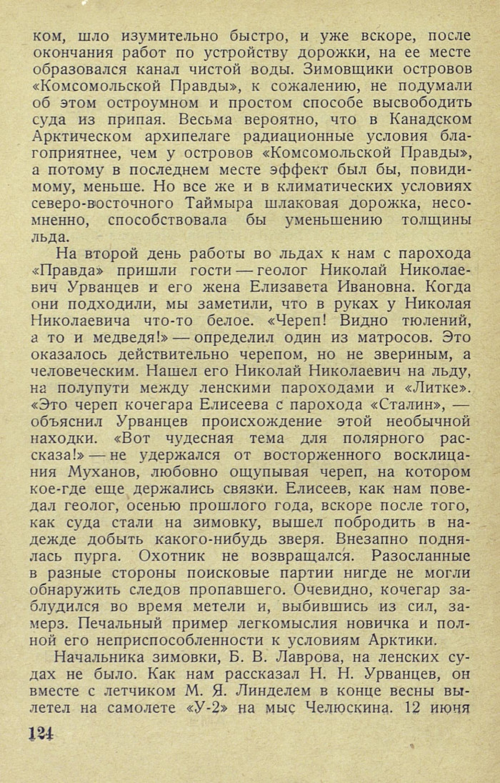 На второй день работы во льдах к нам с парохода «Правда» пришли гости — геолог Николай Николаевич Урванцев и его жена Елизавета Ивановна. Когда они подходили, мы заметили, что в руках у Николая Николаевича что-то белое. «Череп! Видно тюлений, а то и медведя! » — определил один из матросов. Это оказалось действительно черепом, но не звериным, а человеческим. Нашел его Николай Николаевич на льду, на полупути между ленскими пароходами и «Литке». «Это череп кочегара Елисеева с парохода «Сталин», — объяснил Урванцев происхождение этой необычной находки. «Вот чудесная тема для полярного рассказа! » — не удержался от восторженного восклицания Муханов, любовно ощупывая череп, на котором кое-где еще держались связки. Елисеев, как нам поведал геолог, осенью прошлого года, вскоре после того, как суда стали на зимовку, вышел побродить в надежде добыть какого-нибудь зверя. Внезапно поднялась пурга. Охотник не возвращался. Разосланные в разные стороны поисковые партии нигде не могли обнаружить следов пропавшего. Очевидно, кочегар заблудился во время метели и, выбившись из сил, замерз. Печальный пример легкомыслия новичка и полной его неприспособленности к условиям Арктики.