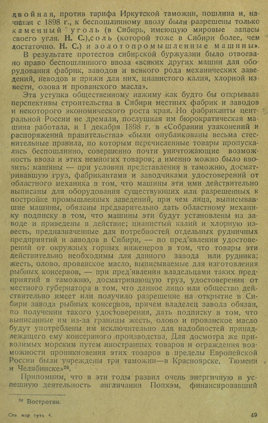 СЕВЕРНЫЙ МОРСКОЙ ПУТЬ И ЦАРСКОЕ ПРАВИТЕЛЬСТВОТорговля с Сибирью как колонией, по исконным путям через Урал была сосредоточена в руках небольшой, но чрезвычайно влиятельной группы петербургских и московских биржевых тузов, менее всего заинтересованных в развитии непосредственных внешнеторговых сообщений Сибири, которые, естественно, повели бы к усилению местного сибирского торгового и промышленного капитала и местной промышленности. Вот этого-то и боялось правительство, Отражавшее интересы поддерживавших его групп капиталистов.