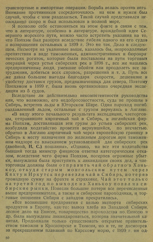 Я позволю себе остановиться на этом факте в связи с тем, что в литературе, особенно в литературе, враждебной идее Северного морского пути, можно часто встретить указания на то, что Попхэм был разорен вследствие гибели одного из его судов и возвращения остальных в 1899 г. Это не так. Дело в следующем. Несмотря на указанные выше, казалось бы, непреодолимые препятствия в виде таможенных, административных и бюрократических рогаток, которые были поставлены на пути торговых операций через устья сибирских рек в 1898 г., все же нашлись предприимчивые люди, умевшие обойти или преодолеть все затруднения, добиться всех справок, разрешений и т. д. Путь все же давал большие выгоды благодаря скорости, дешевизне и удобству доставки грузов, предназначенных для севера. Поэтому Попхэмом в 1899 г. была вновь организована очередная экспедиция из 5 судов.