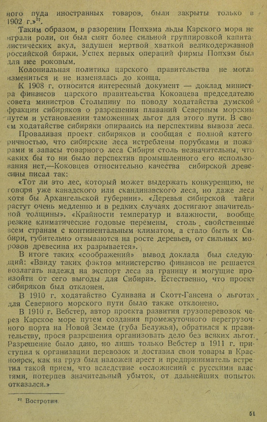 К 1908 г. относится интересный документ — доклад министра финансов царского правительства Коковцева председателю совета министров Столыпину по поводу ходатайства думской фракции сибиряков о разрешении плаваний Северным морским путем и установлении таможенных льгот для этого пути. В своем ходатайстве сибиряки опирались на перспективы вывоза леса.