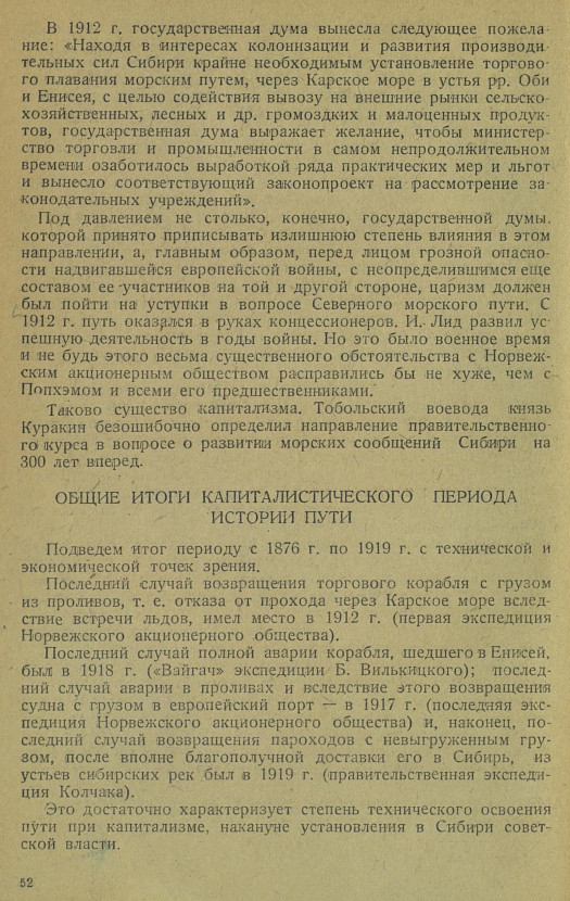 Вот смысл и сущность транспортно-строительной политики до Октябрьской революции. И если так обстоял вопрос для железных дорог, что же остается говорить о сочувствии руководящих центров капиталистической России такому делу, как Северный морской путь в Сибирь, экономическое значение которого для Сибири столь очевидно. В представлении царских бюрократов это было равносильно отложению Сибири от России.