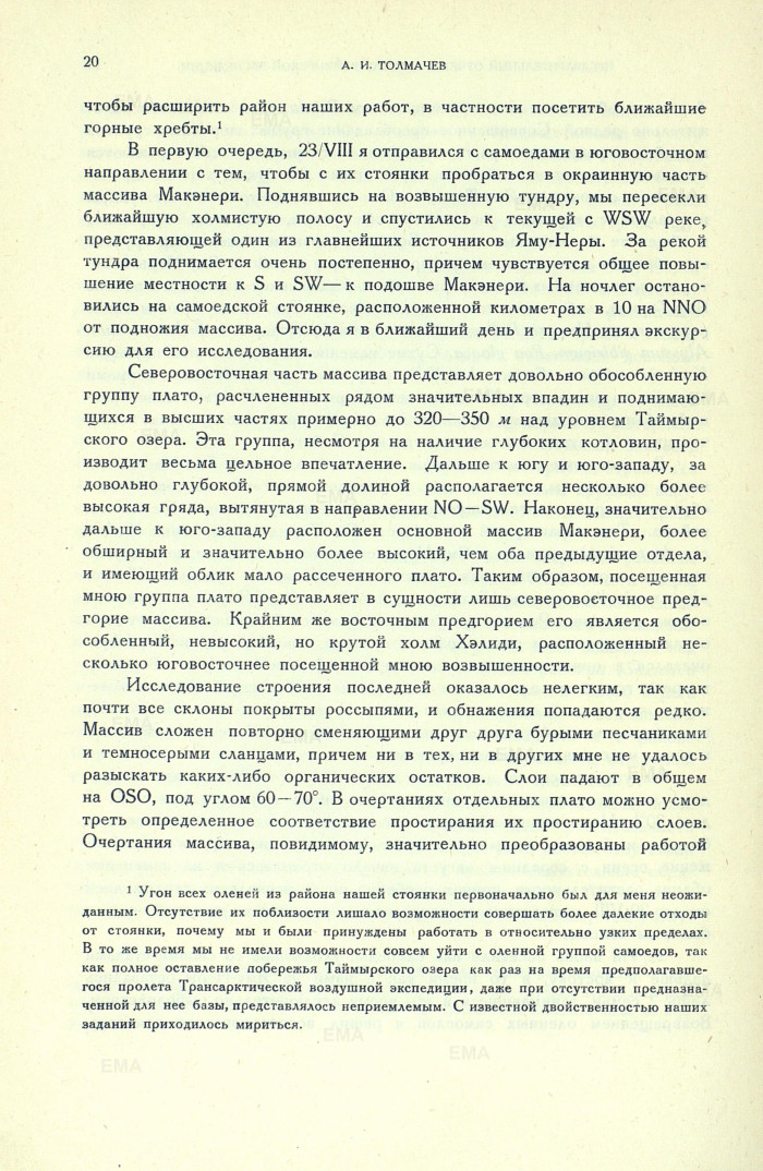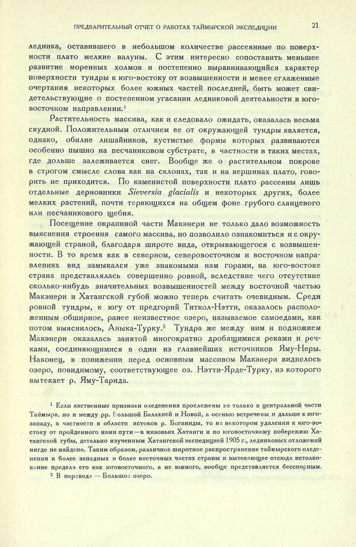 ледника, оставившего в небольшом количестве рассеянные по поверхности плато мелкие валуны. С этим интересно сопоставить меньшее развитие моренных холмов и постепенно выравнивающийся характер поверхности тундры к юго-востоку от возвышенности и менее сглаженные очертания некоторых более южных частей последней, быть может свидетельствующие о постепенном угасании ледниковой деятельности в юго-восточном направлении. {1}