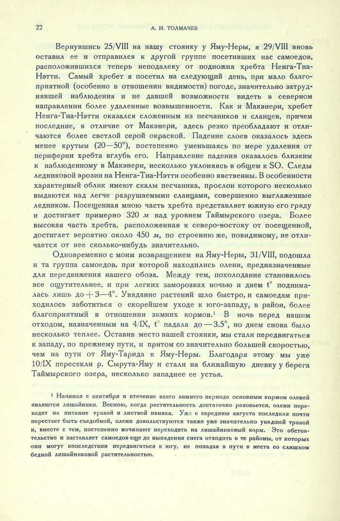 Одновременно с моим возвращением на Яму-Неры, 31/VIII, подошла и та группа самоедов, при которой находились олени, предназначенные для передвижения нашего обоза. Между тем, похолодание становилось все ощутительнее, и при легких заморозках ночью и днем t° поднималась лишь до + З—4°. Увядание растений шло быстро, и самоедам приходилось заботиться о скорейшем уходе к юго-западу, в район, более благоприятный в отношении зимних кормов. {1} В ночь перед нашим отходом, назначенным на 4/IX, t° падала до — 3. 5°, но днем снова было несколько теплее. Оставив место нашей стоянки, мы стали передвигаться к западу, по прежнему пути, и притом со значительно большей скоростью, чем на пути от Яму-Тарида к Яму-Неры. Благодаря этому мы уже 10/IX пересекли р. Сырута-Яму и стали на ближайшую дневку у берега Таймырского озера, несколько западнее ее устья.