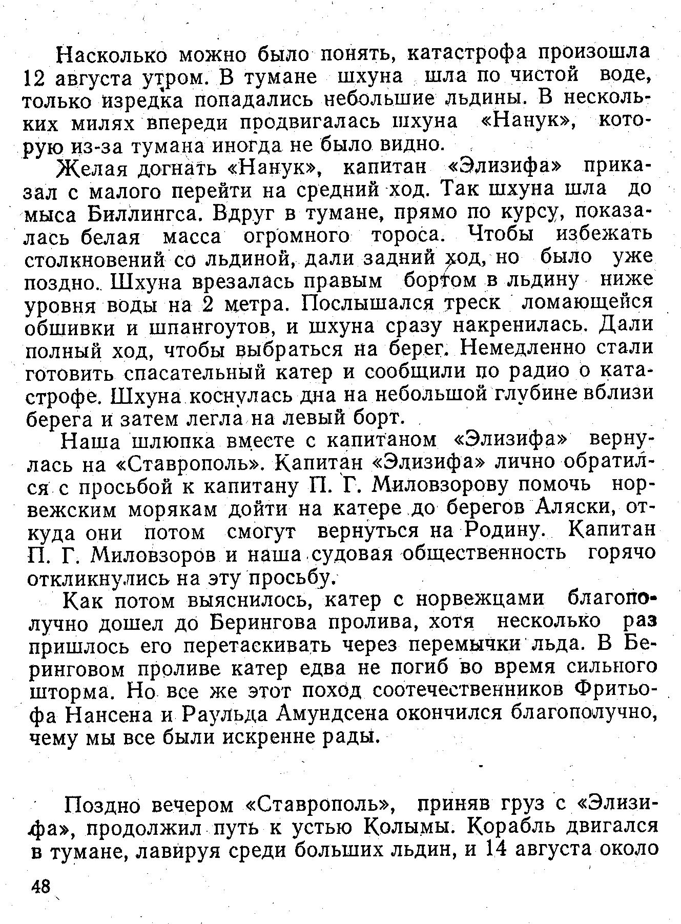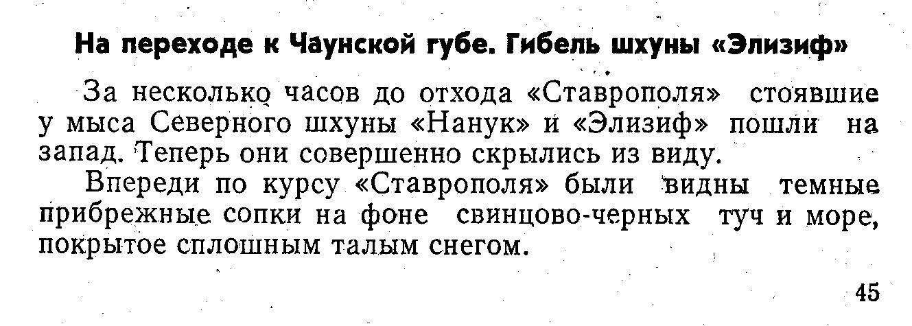 «Ставрополь», пользуясь хорошей видимостью, шел теперь, обходя льдины, полным ходом к мысу Биллингса, где находилась шхуна «Элизиф».