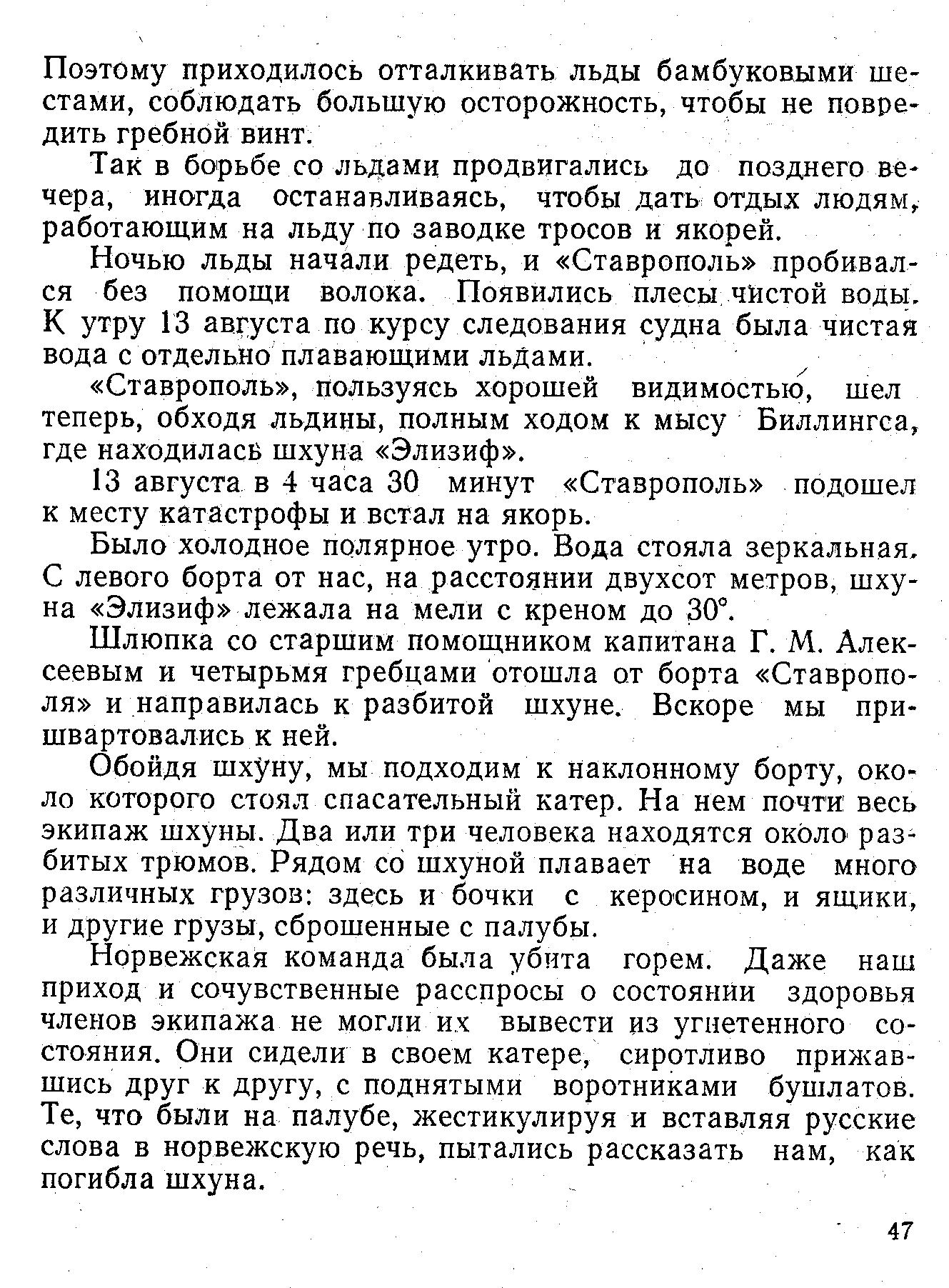 Наша шлюпка вместе с капитаном «Элизифа» вернулась на «Ставрополь». Капитан «Элизифа» лично обратился с просьбой к капитану П. Г. Миловзорову помочь норвежским морякам дойти на катере до берегов Аляски, откуда они потом смогут вернуться на Родину. Капитан П. Г. Миловзоров и наша судовая общественность горячо откликнулись на эту просьбу.