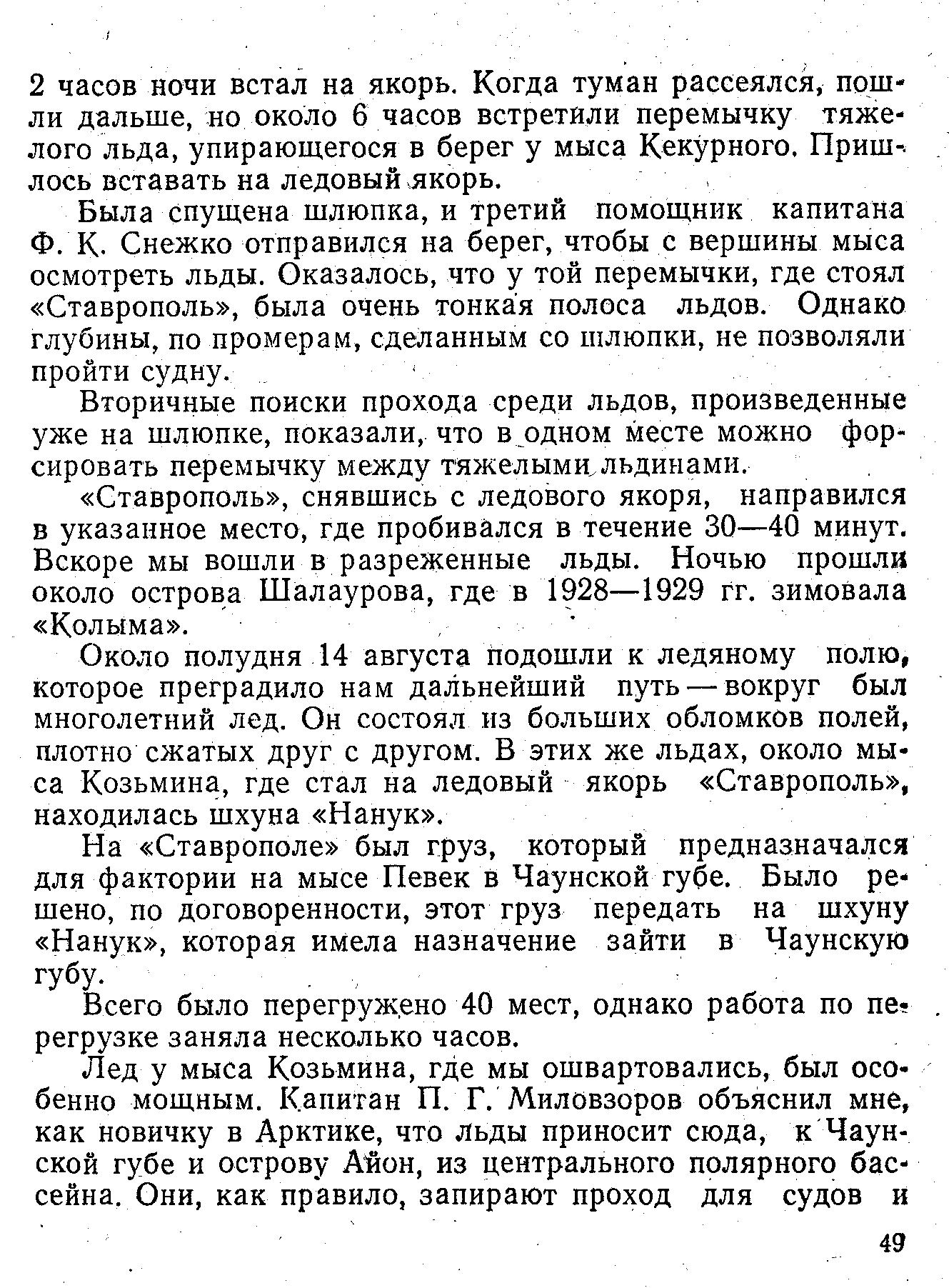 «Ставрополь», снявшись с ледового якоря, направился в указанное место, где пробивался в течение 30—40 минут. Вскоре мы вошли в разреженные льды. Ночью прошли около острова Шалаурова, где в 1928—1929 гг. зимовала «Колыма».