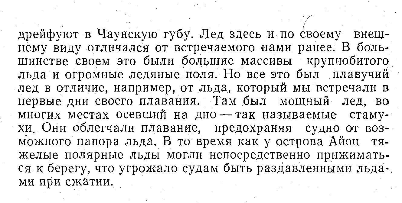 дрейфуют в Чаунскую губу. Лед здесь и по своему внешнему виду отличался от встречаемого нами ранее. В большинстве своем это были большие массивы крупнобитого льда и огромные ледяные поля. Но все это был плавучий лед в отличие, например, от льда, который мы встречали в первые дни своего плавания. Там был мощный лед, во многих местах осевший на дно — так называемые стамухи. Они облегчали плавание, предохраняя судно от возможного напора льда. В то время как у острова Айон тяжелые полярные льды могли непосредственно прижиматься к берегу, что угрожало судам быть раздавленными льдами при сжатии.