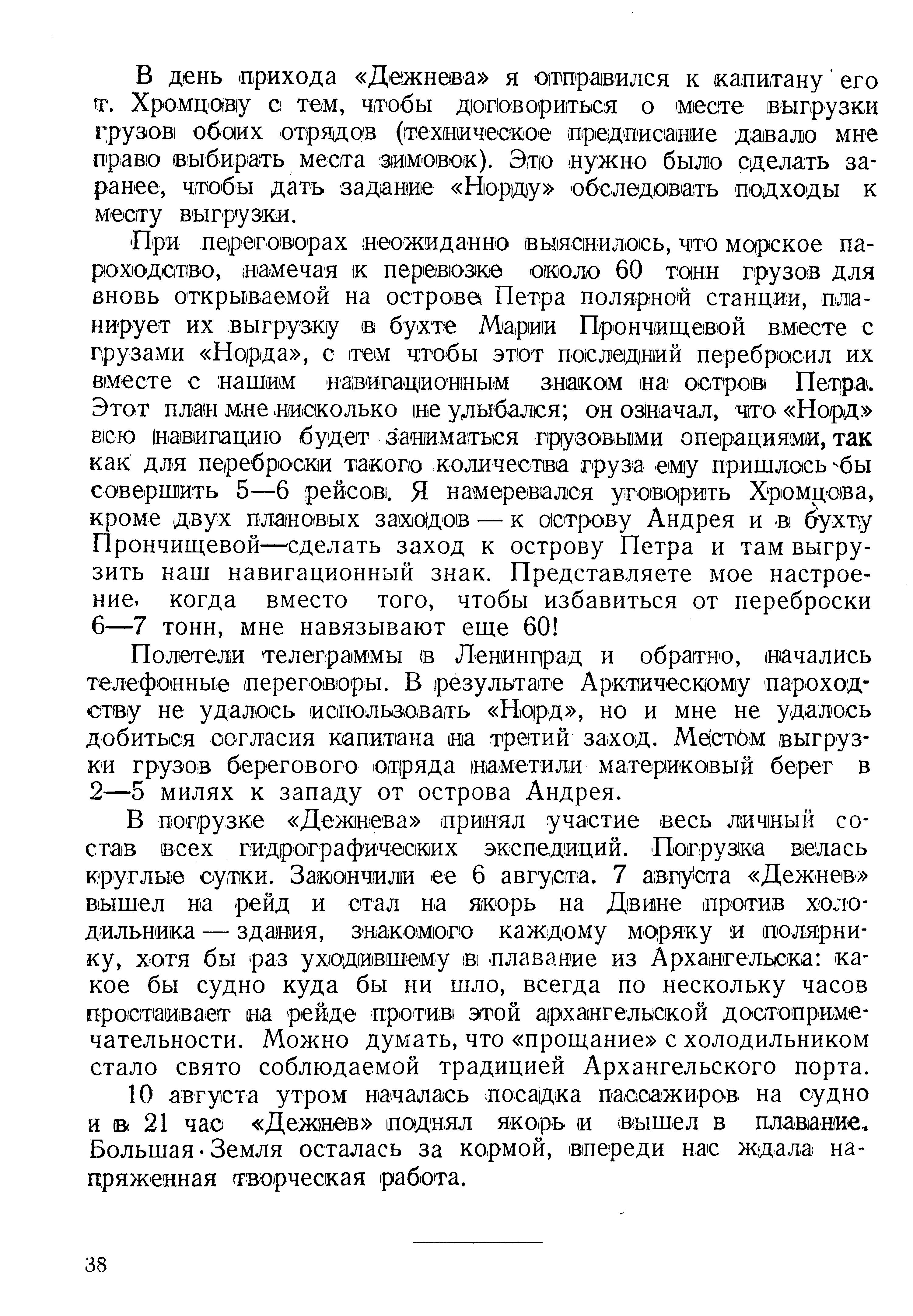 В погрузке «Дежнева» принял участие весь личный состав всех гидрографических экспедиций. Погрузка велась круглые сутки. Закончили ее 6 августа. 7 августа «Дежнев» вышел на рейд и стал на якорь на Двине против холодильника — здания, знакомого каждому моряку и полярнику, хотя бы раз уходившему B плавание из Архангельска: какое бы судно куда бы ни шло, всегда по нескольку часов простаивает на рейде против этой архангельской достопримечательности. Можно думать, что «прощание» с холодильником стало свято соблюдаемой традицией Архангельского порта.
