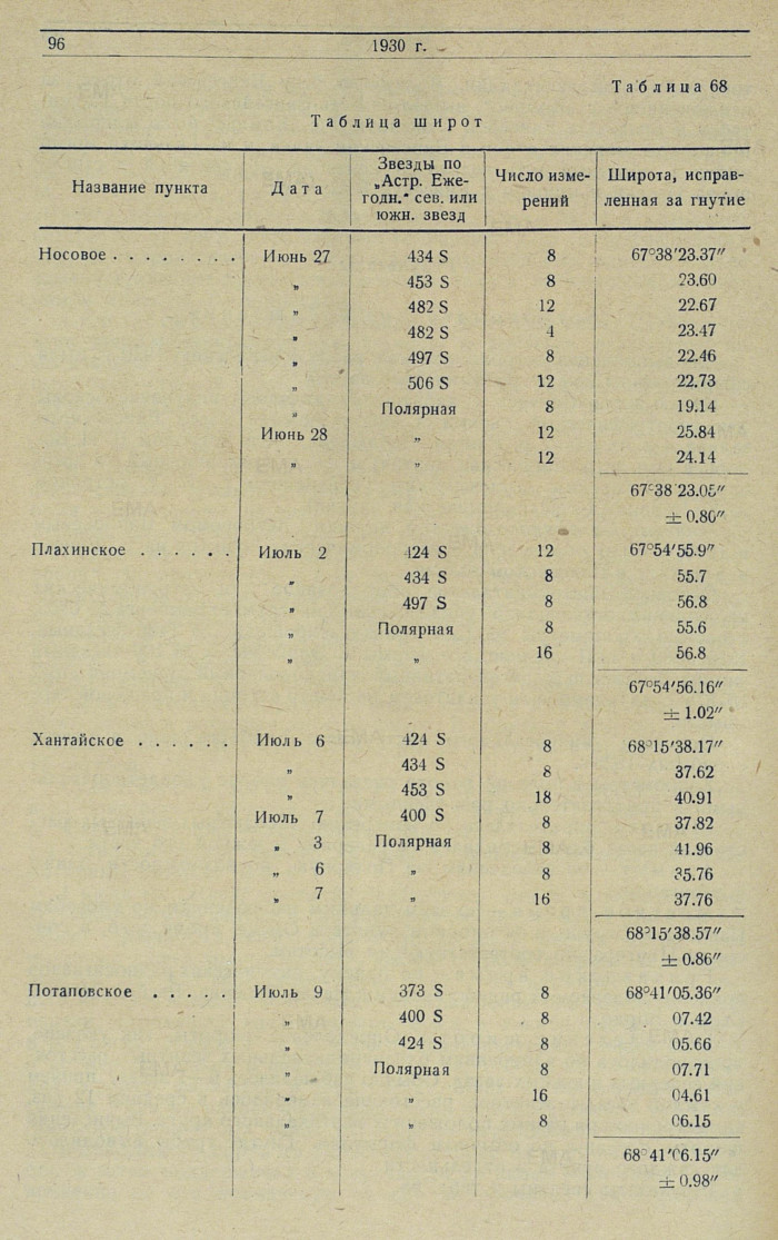 Определение долготы. Ha 11 экспедиционных пунктах 1930 г. поправка рабочего хронометра относительно местного звездного времени определялась по 68 звездам, большей частью по способу Павлова. Результаты сведены в табл. 69.
