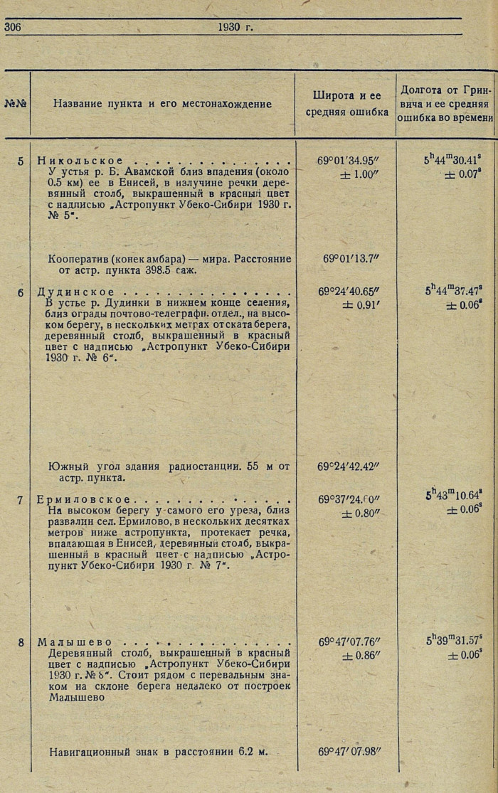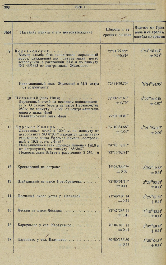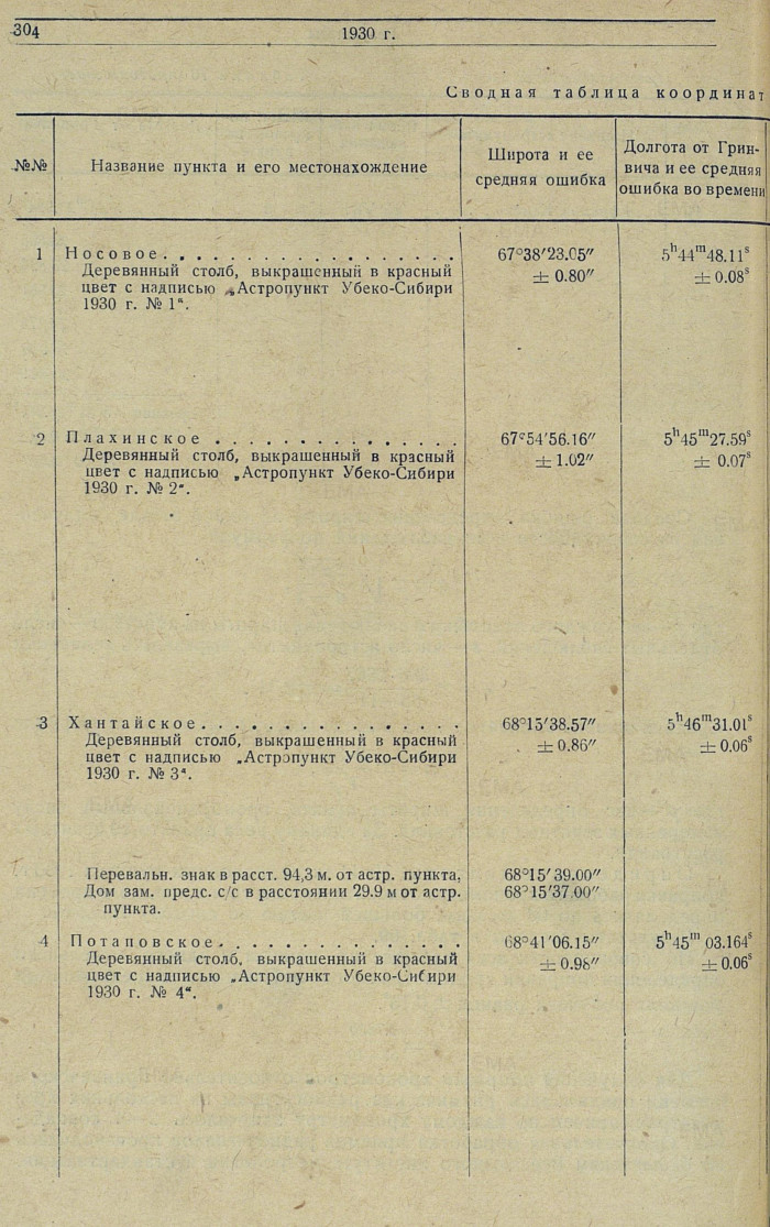 Сводная таблица координат астропунктов, определенных в 1930 г.