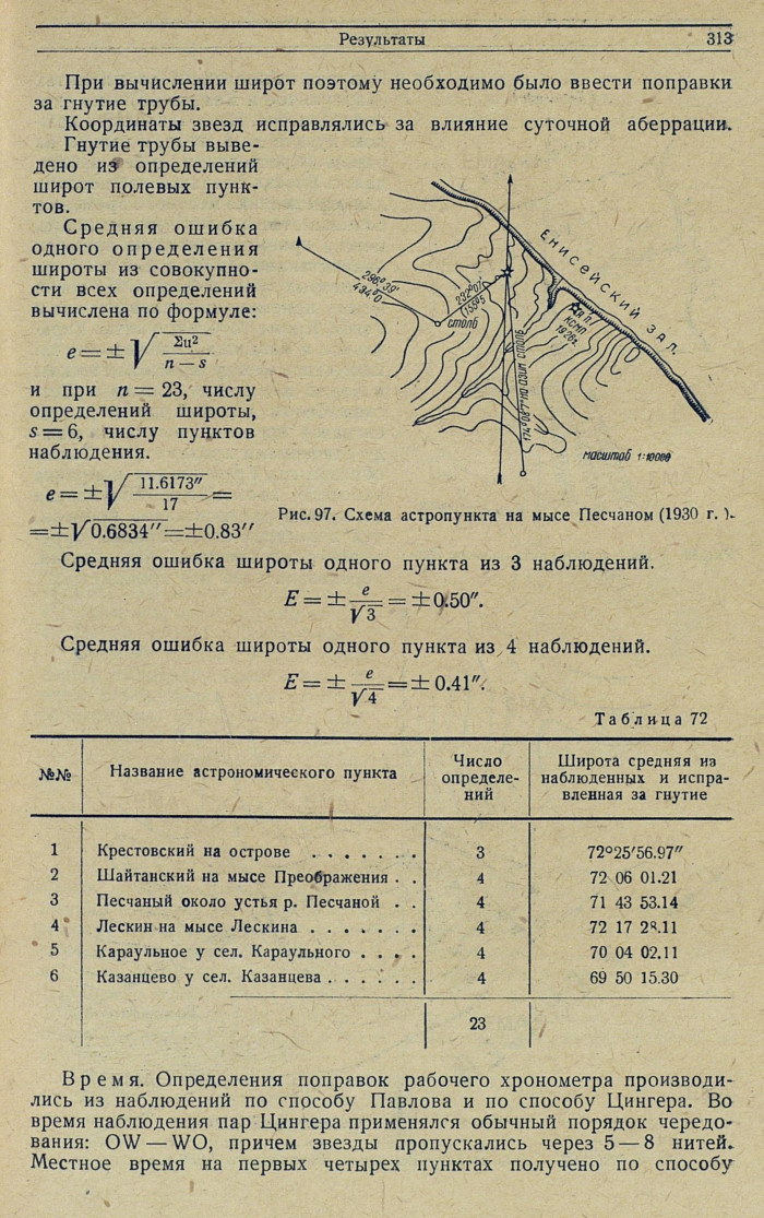 Определение широты. Определение широты, как указано, производилось по измерениям близмеридианальных зенитных расстояний северных и южных звезд. Обычно наблюдалось 6—7 звезд, причем у каждой звезды зенитное расстояние измерялось в среднем 12 раз, симметрично при разных положениях вертикального круга. Вычисления широты сделаны по обычным формулам. Гнутие трубы выводилось для каждого пункта в отдельности.