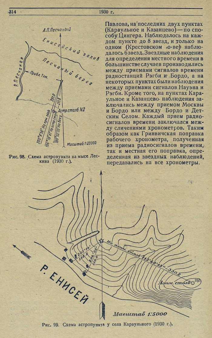 Павлова, на последних двух пунктах (Караульное и Казанцево) — по способу Цингера. Наблюдалось на каждом пункте до 8 звезд, и только на одном (Крестовском о-ве) наблюдалось 6 звезд. Звездные наблюдения для определения местного времени в большинстве случаев производились между приемами сигналов времени радиостанций Рэгби и Бордо, а на некоторых пунктах были наблюдения между приемами сигналов Науэна и Рэгби. Кроме того, на пунктах Караульное и Казанцево - наблюдения заключались между приемом Москвы и Бордо или между Бордо и Детским Селом. Каждый прием радиосигналов времени заключался между сличениями хронометров. Таким образом как Гринвичская поправка рабочего хронометра, полученная из приема радиосигналов времени, так и местная его поправка, определенная из звездных наблюдений, передавались на все хронометры.