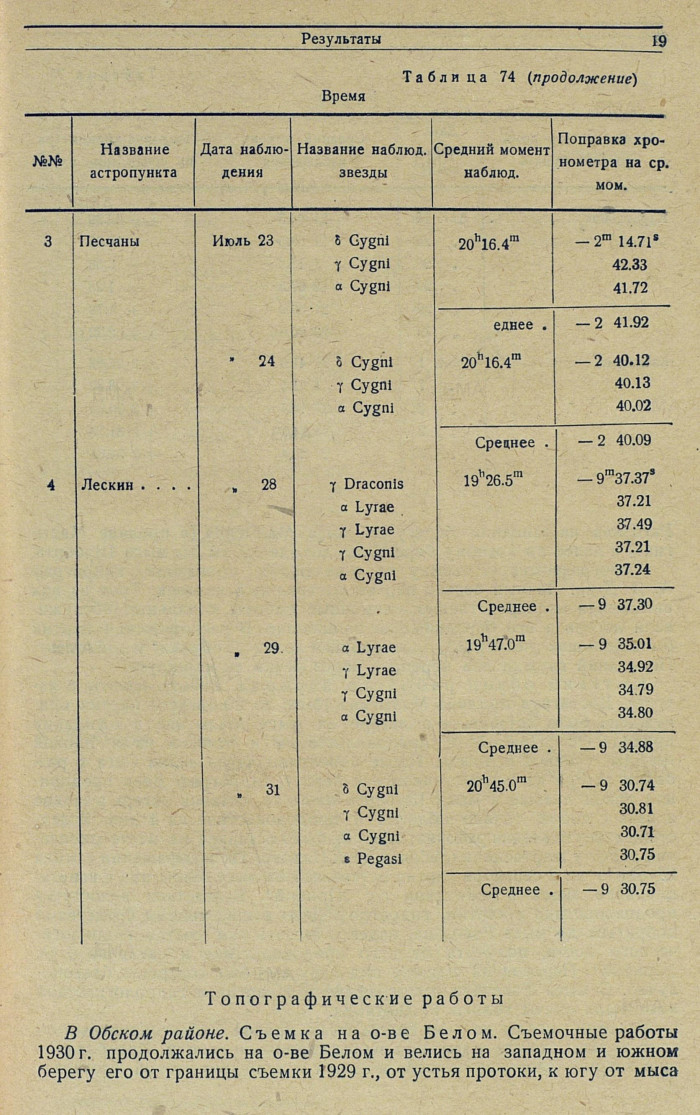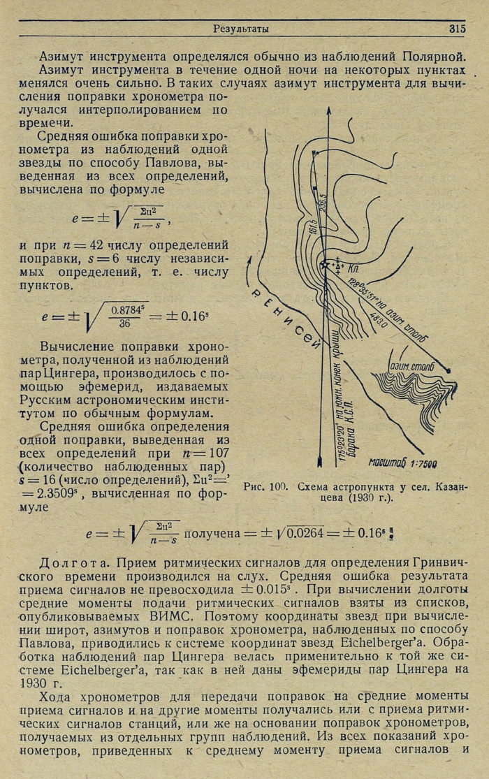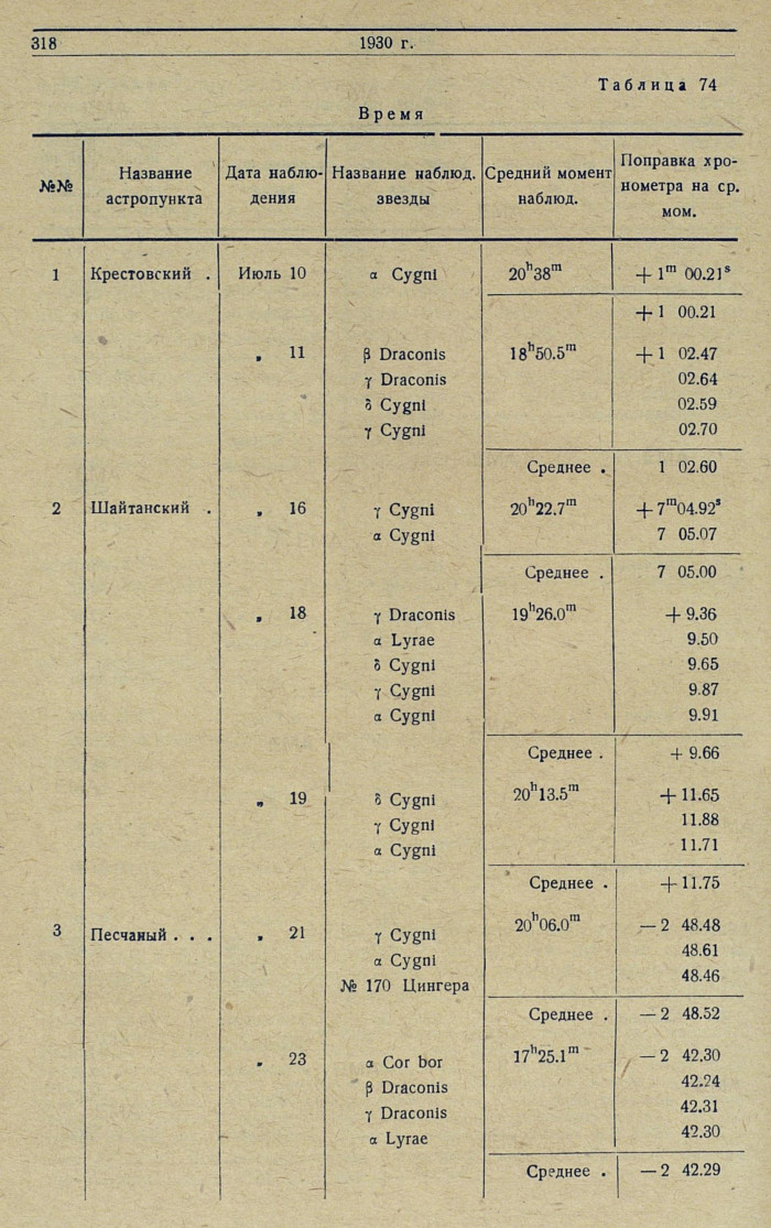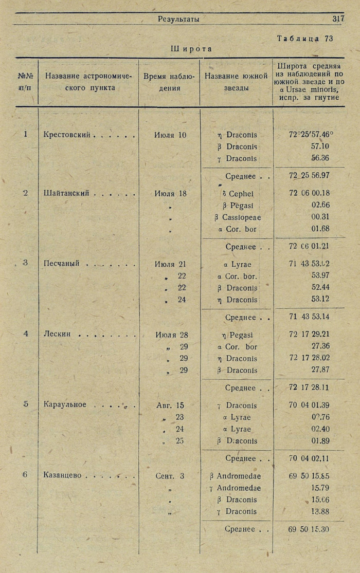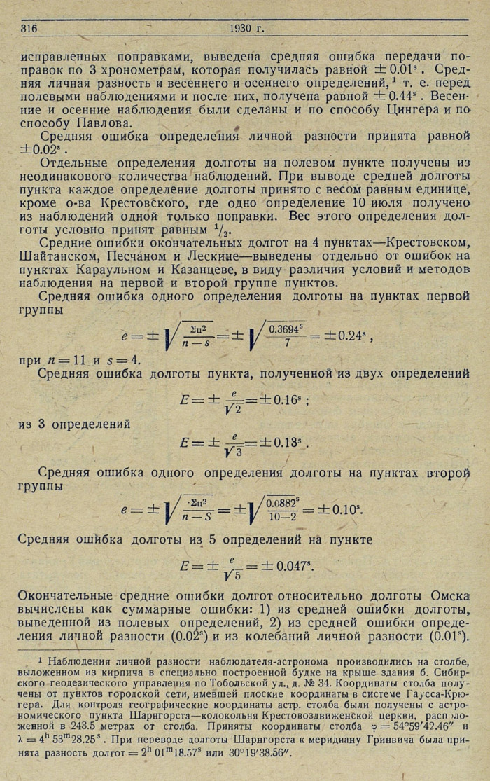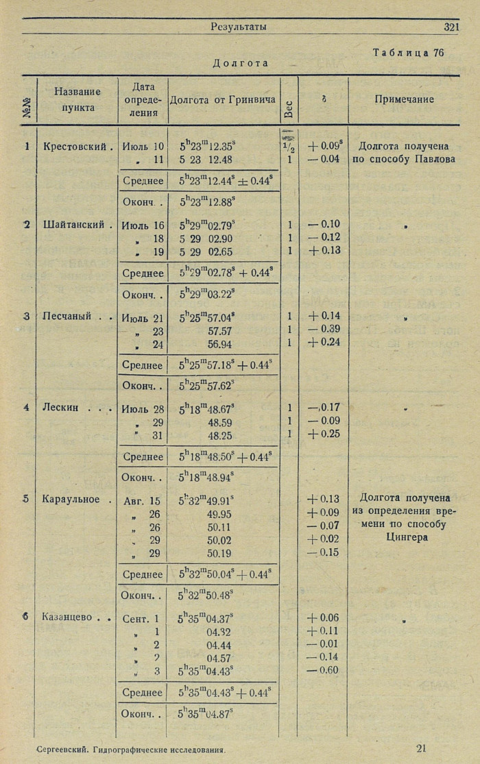 Средние ошибки окончательных долгот на 4 пунктах — Крестовском, Шайтанском, Песчаном и Лескине — выведены отдельно от ошибок на пунктах Караульном и Казанцеве, в виду различия условий и методов наблюдения на первой и второй группе пунктов.