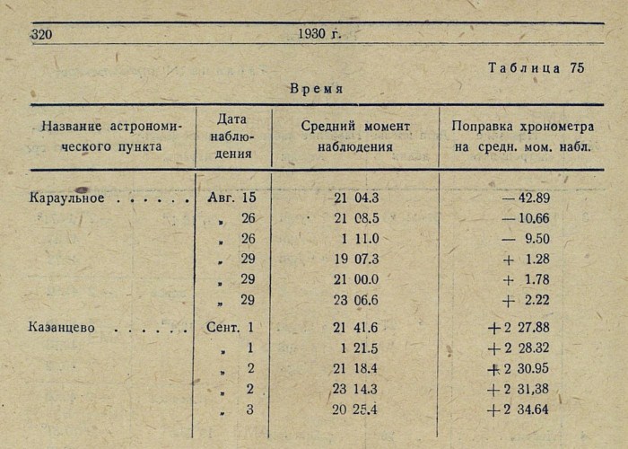Азимут инструмента в течение одной ночи на некоторых пунктах менялся очень сильно. В таких случаях азимут инструмента для вычисления поправки хронометра получался интерполированием по времени.