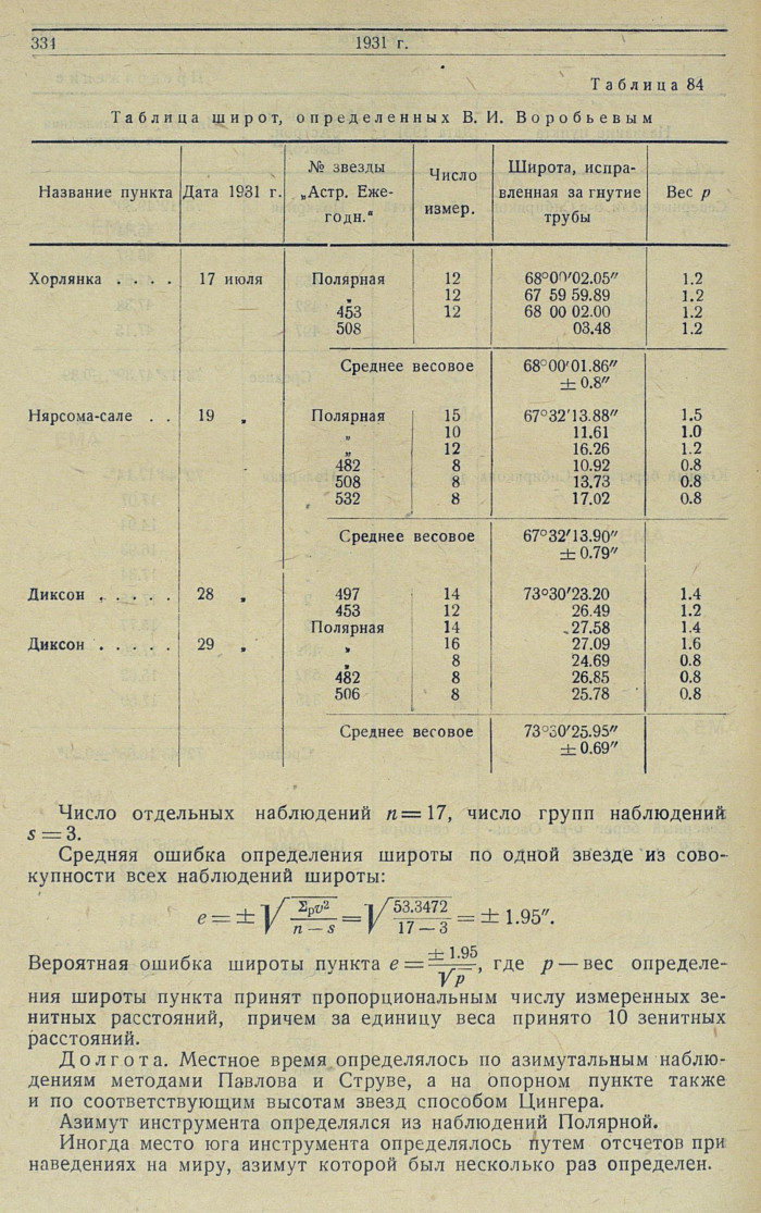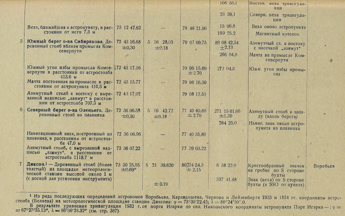 {1} Из ряда последующих определений астрономов Воробьева, Карандашева, Чернова и Лейзенберга 1933 и 1834 гг. координаты астростолба (Беляева) на метеорологической площадке станции Диксона: φ = 73°30'22.45; λ = 80°24'10".0.