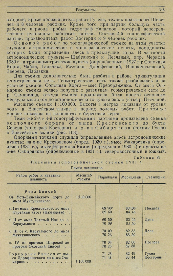 В горле р. Енисея продолжена топографическая съемка к северу от границы съемки 1928 г., именно: от мыса Дорофеевского на левом берегу и р. Верхней Кареповской на правом — до залива: до мыса Ошмарино по левому — и до мыса Сопочной Корги по правому берегу.