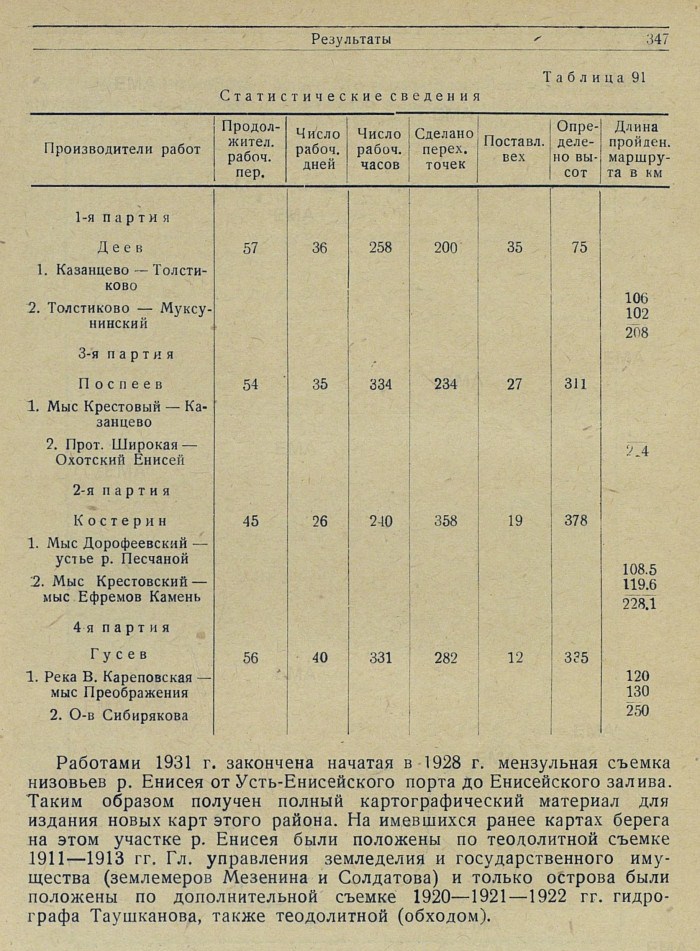 Работами 1931 г. закончена начатая в 1928 г. мензульная съемка низовьев р. Енисея от Усть-Енисейского порта до Енисейского залива. Таким образом получен полный картографический материал для издания новых карт этого района. На имевшихся ранее картах берега на этом участке р. Енисея были положены по теодолитной съемке 1911—1913 гг. Гл. управления земледелия и государственного имущества (землемеров Мезенина и Солдатова) и только острова были положены по дополнительной съемке 1920—1921—1922 гг. гидрографа Таушканова, также теодолитной (обходом).