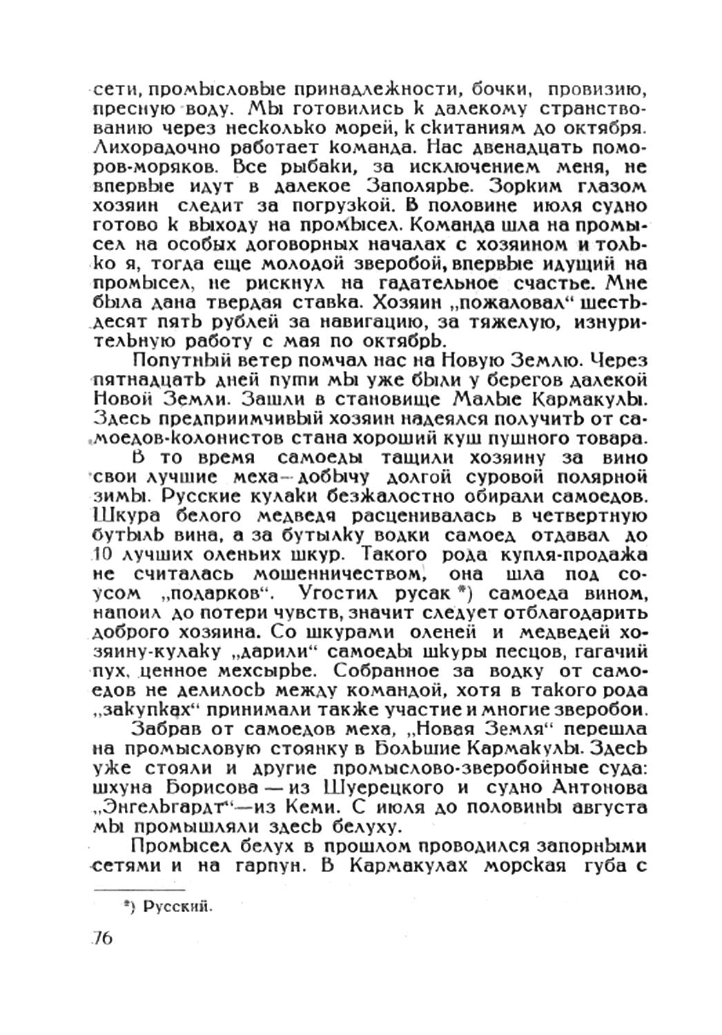сети, промысловые принадлежности, бочки, провизию, пресную волу. Мы готовились к далекому странствованию через несколько морей, к скитаниям до октября. Лихорадочно работает команда. Нас двенадцать поморов-моряков. Все рыбаки, за исключением меня, не впервые идут в далекое Заполярье. Зорким глазом хозяин следит за погрузкой. В половине июля судно готово к выходу на промысел. Команда шла на промысел на особых договорных началах с хозяином и только я, тогда еще молодой зверобой, впервые идущий на промысел, не рискнул на гадательное счастье. Мне была дана твердая ставка. Хозяин "пожаловал" шестьдесят пять рублей за навигацию, за тяжелую, изнурительную работу с мая по октябрь.
