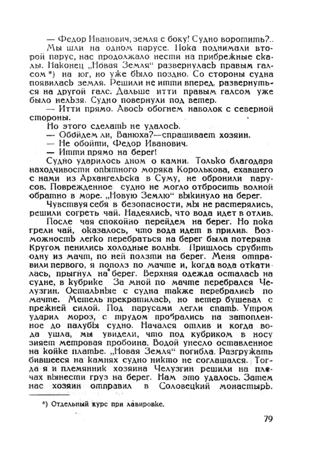 После чая спокойно перейдем на берег. Но пока грели чай, оказалось, что вода идет в прилив, возможность легко перебраться на берег была потеряна Кругом пенились холодные волны. Пришлось срубить одну из мачт, по ней ползти на берег. Меня отправили первого, я пополз по мачте и, когда вода откатилась, прыгнул на берег, верхняя одежда осталась на судне, в кубрике. За мной по мачте перебрался Челузгин. Остальные с судна также перебрались по мачте. Метель прекратилась, но ветер бушевал с прежней силой. Под парусами легли спать. Утром ударил мороз, с трудом пробрались на затопленное до палубы судно. Начался отлив и когда вода ушла, мы увидели, что под кубриком в носу зияет метровая пробоина. Водой унесло оставленное на койке платье. "Новая Земля" погибла. Разгружать бившееся на камнях судно никто не соглашался. Тогда я и племянник хозяина Челузгин решили на плечах вынести груз на берег. Нам это удалось. Затем нас хозяин отправил в Соловецкий монастырь.