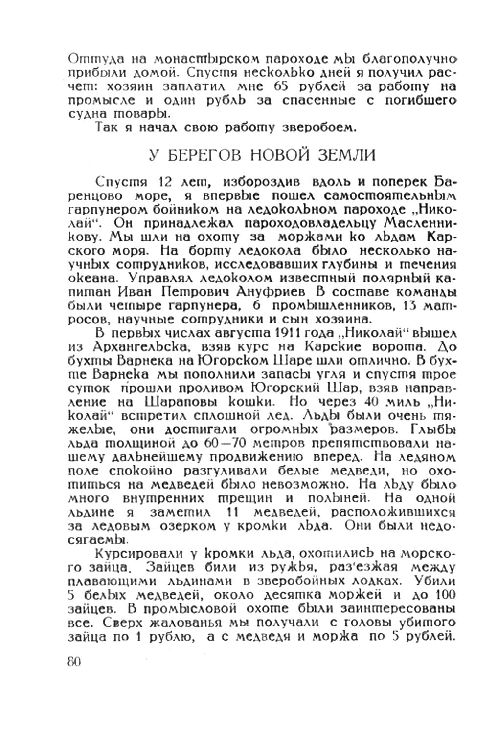 У БЕРЕГОВ НОВОЙ ЗЕМЛИ Спустя 12 лет, избороздив вдоль и поперек Баренцово море, я впервые пошел самостоятельным гарпунером бойником на ледокольном пароходе "Николай". Он принадлежал пароходовладельцу Масленникову. Мы шли на охоту за моржами ко льдам Карского моря. На борту ледокола было несколько научных сотрудников, исследовавших глубины и течения океана. Управлял ледоколом известный полярный капитан Иван Петрович Ануфриев В составе команды были четыре гарпунера, 6 промышленников, 13 матросов, научные сотрудники и сын хозяина.