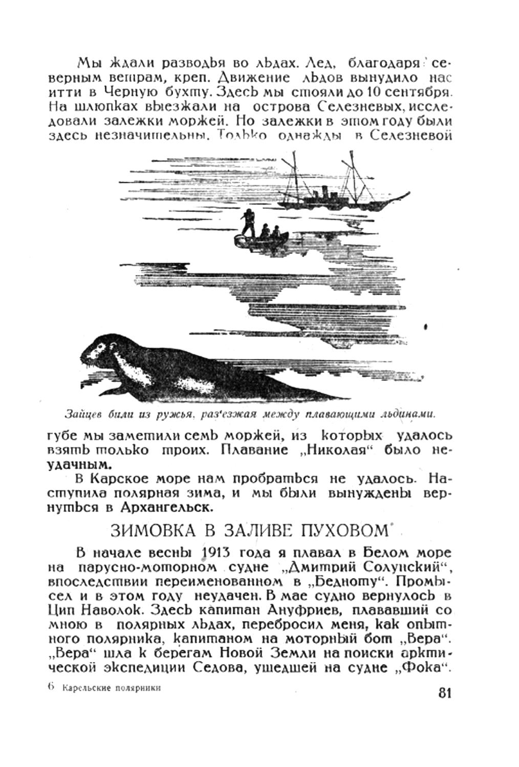 ЗИМОВКА В ЗАЛИВЕ ПУХОВОМВ начале весны 1913 года я плавал в Белом море на парусно-моторном судне "Дмитрий Солунский", впоследствии переименованном в "Бедноту". Промысел и в этом году неудачен. В мае судно вернулось в Цип Наволок. Здесь капитан Ануфриев, плававший со мною в полярных льдах, перебросил меня, как опытного полярника, капитаном на моторный бот "Вера". "Вера" шла к берегам Новой Земли на поиски арктической экспедиции Седова, ушедшей на судне "Фока".