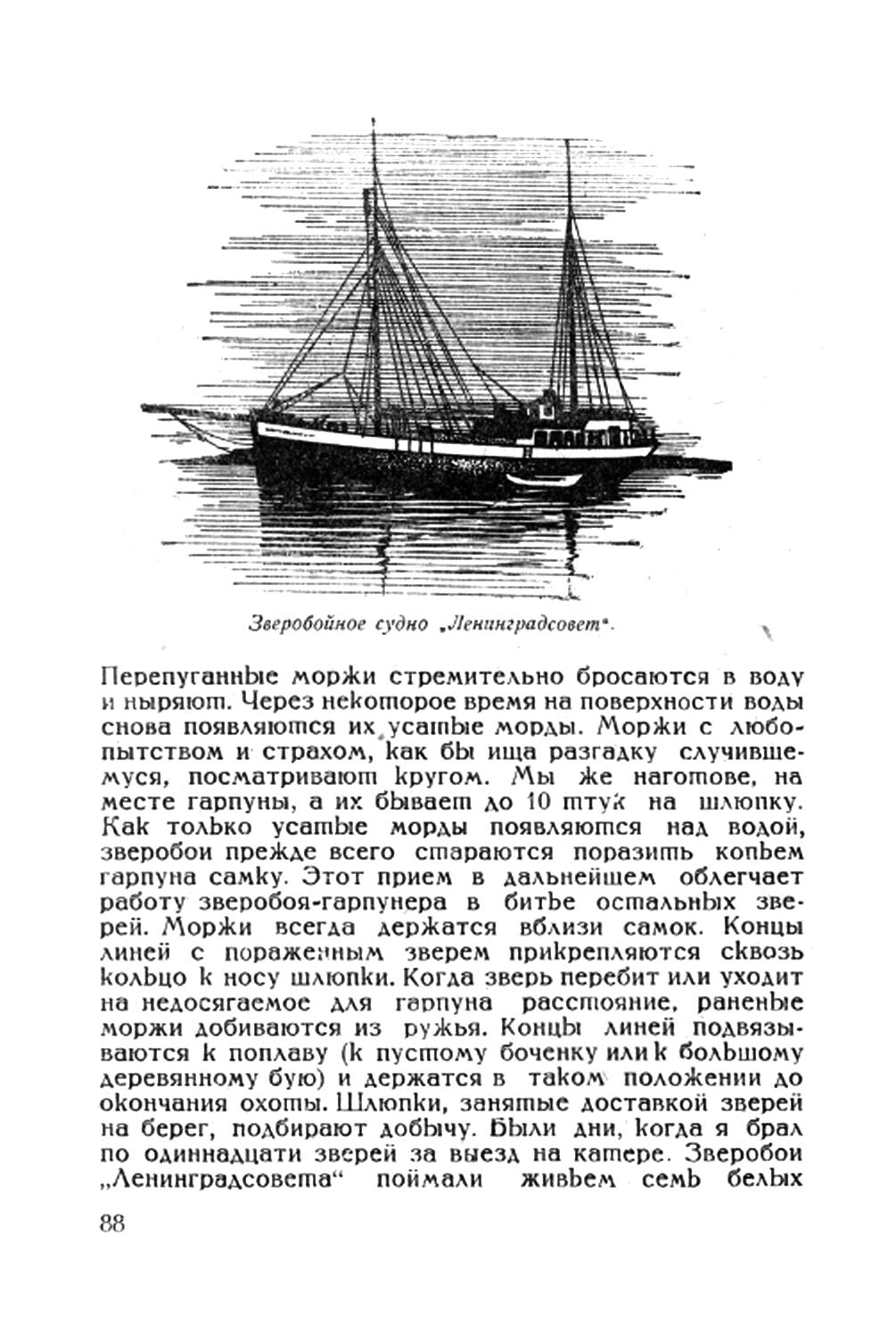 Перепуганные моржи стремительно бросаются в воду и ныряют. Через некоторое время на поверхности волы снова появляются их усатые морды. Моржи с любопытством и страхом, как бы ища разгадку случившемуся, посматривают кругом. Мы же наготове, на месте гарпуны, а их бывает до 10 штук на шлюпку. Как только усатые морды появляются нал водой, зверобои прежде всего стараются поразить копьём гарпуна самку. Этот прием в дальнейшем облегчает работу зверобоя-гарпунера в битье остальных зверей. Моржи всегда держатся вблизи самок. Концы линей с пораженным зверем прикрепляются сквозь кольцо к носу шлюпки. Когда зверь перебит или уходит на недосягаемое для гарпуна расстояние. раненые моржи добиваются из ружья. Концы линей подвязываются к поплаву (к пустому бочонку или к большому деревянному бую) и держатся в таком положении до окончания охоты. Шлюпки, занятые доставкой зверей на берег, подбирают добычу. были дни, когда я брал по одиннадцати зверей за выезд на катере. Зверобои "Ленинградсовета" поймали живьём семь белых