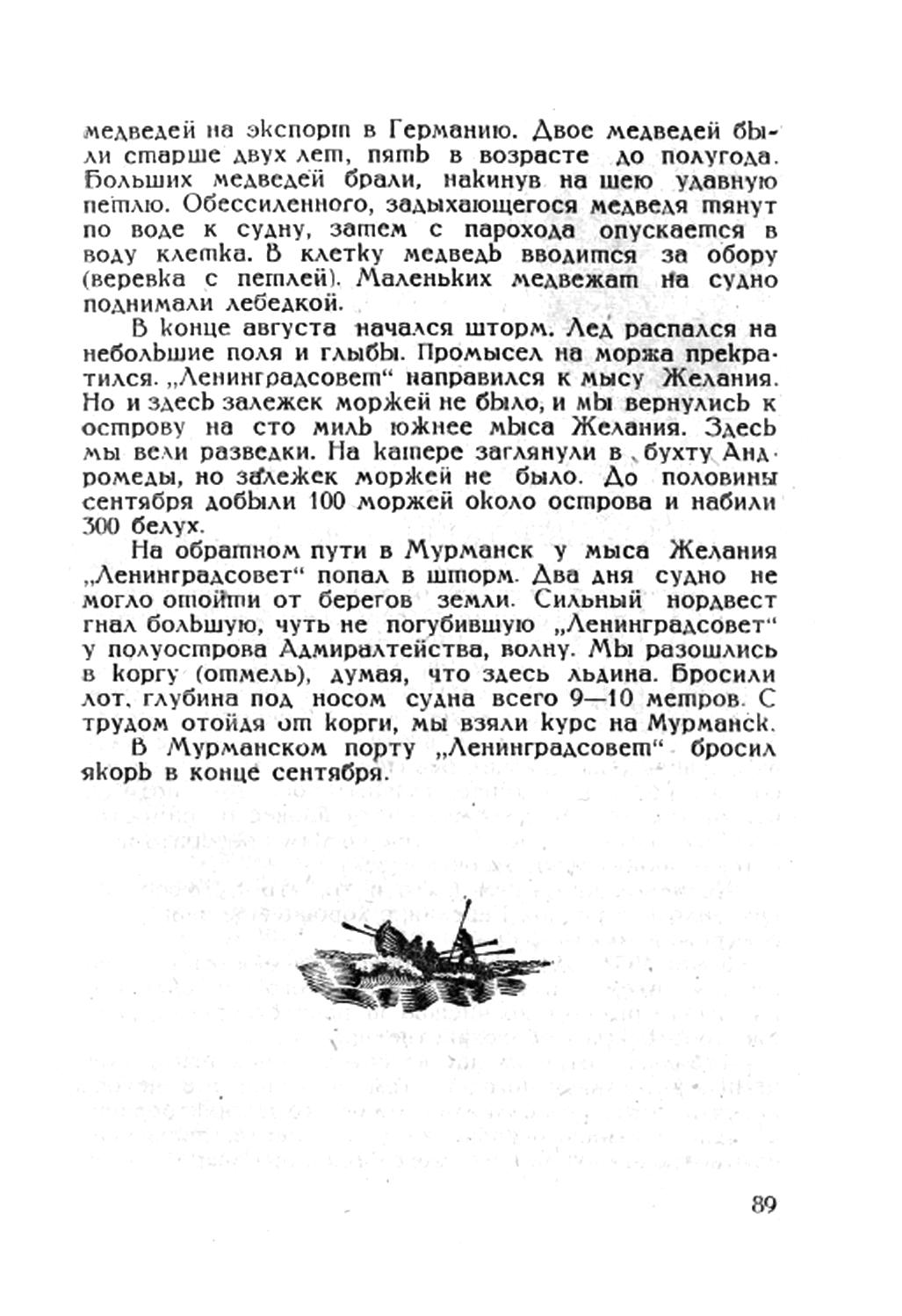 В конце августа начался шторм. Лед распался на небольшие поля и глыбы. Промысел на моржа прекратился. "Ленинградсовет" направился к мысу Желания. Но и здесь залежек моржей не было, и мы вернулись к острову на сто миль южнее мыса Желания. Здесь мы вели разведки. На катере заглянули в бухту Андромеды, но залежек моржей не было. До половины сентября добыли 100 моржей около острова и набили 300 белух.