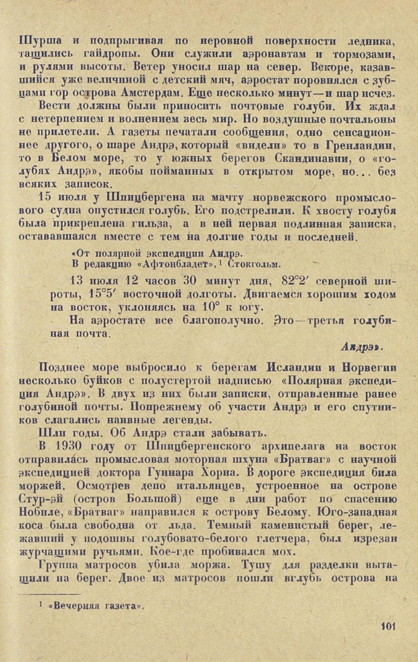 Вести должны были приносить почтовые голуби. Их ждал с нетерпением и волнением весь мир. Но воздушные почтальоны не прилетели. А газеты печатали сообщения, одно сенсационнее другого, о шаре Андрэ, который «видели» то в Гренландии, то в Белом море, то у южных берегов Скандинавии, о «голубях Андрэ», якобы пойманных в открытом море, но... без всяких записок.