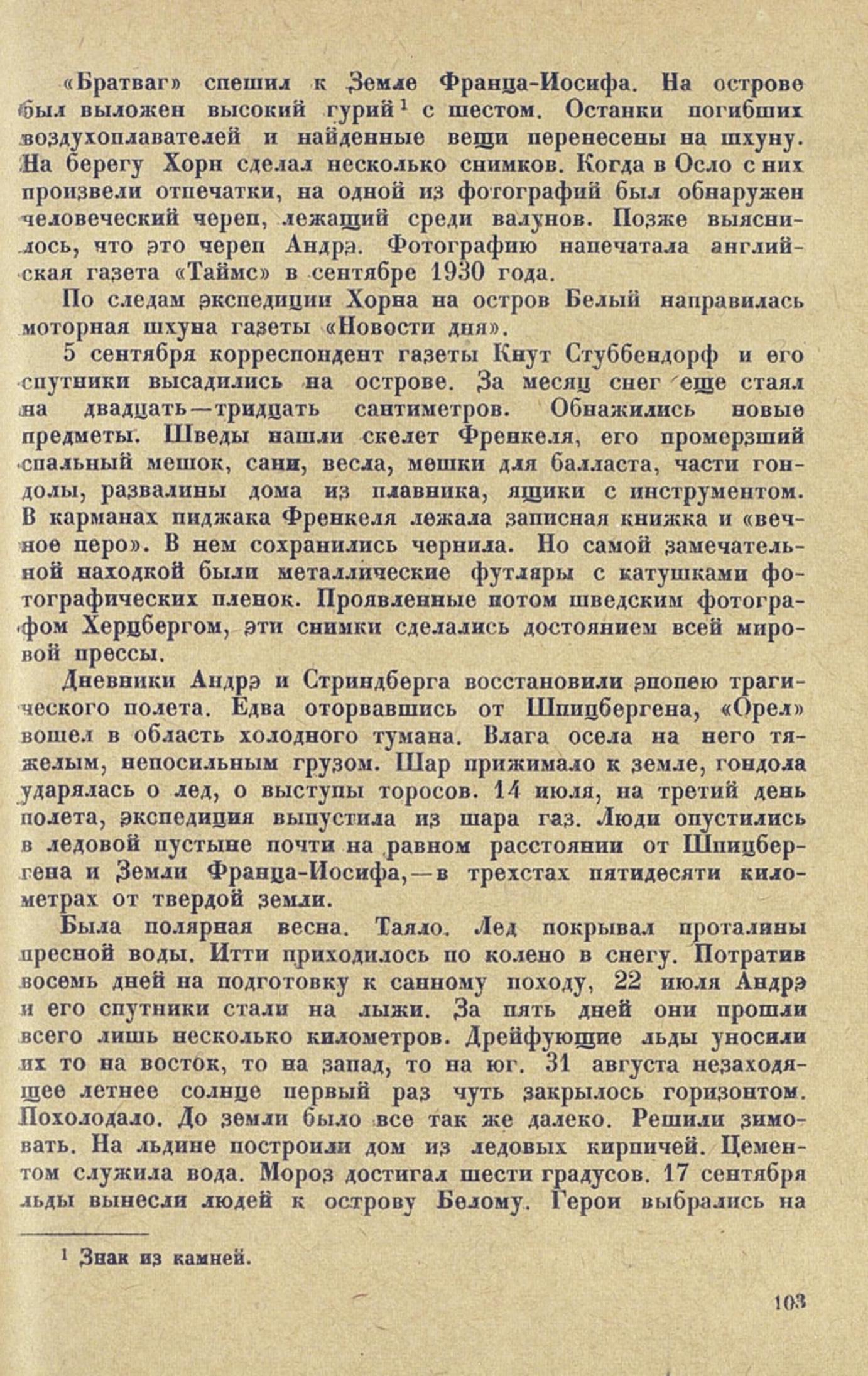«Братваг» спешил к Земле Франца-Иосифа. На острове был выложен высокий гурий {1} с шестом. Останки погибших воздухоплавателей и найденные вещи перенесены на шхуну. На берегу Хорн сделал несколько снимков. Когда в Осло с них произвели отпечатки, на одной из фотографий был обнаружен человеческий череп, лежащий среди валунов. Позже выяснилось, что это череп Андрэ. Фотографию напечатала английская газета «Таймс» в сентябре 1930 года.