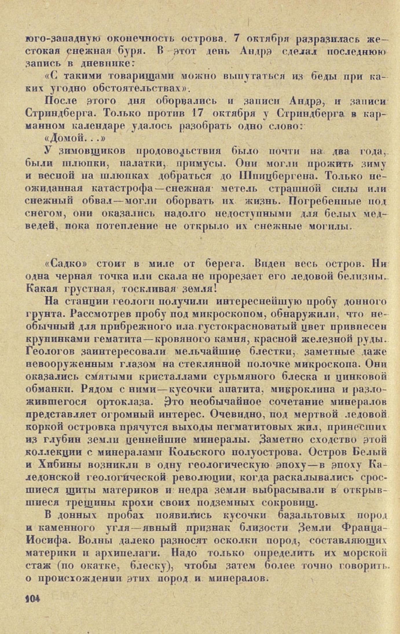 На станции геологи получили интереснейшую пробу донного грунта. Рассмотрев пробу под микроскопом, обнаружили, что необычный для прибрежного ила густокрасноватый цвет привнесен крупинками гематита — кровяного камня, красной железной руды. Геологов заинтересовали мельчайшие блестки,, заметные даже невооруженным глазом на стеклянной полочке микроскопа. Они оказались смятыми кристаллами сурьмяного блеска и цинковой обманки. Рядом с ними — кусочки апатита, микроклина и разложившегося ортоклаза. Это необычайное сочетание минералов представляет огромный интерес. Очевидно, под мертвой ледовой коркой островка прячутся выходы пегматитовых жил, принесших из глубин земли ценнейшие минералы. Заметно сходство этой коллекции с минералами Кольского полуострова. Остров Белый и Хибины возникли в одну геологическую эпоху — в эпоху Каледонской геологической революции, когда раскалывались сросшиеся щиты материков и недра земли выбрасывали в открывшиеся трещины крохи своих подземных сокровищ.