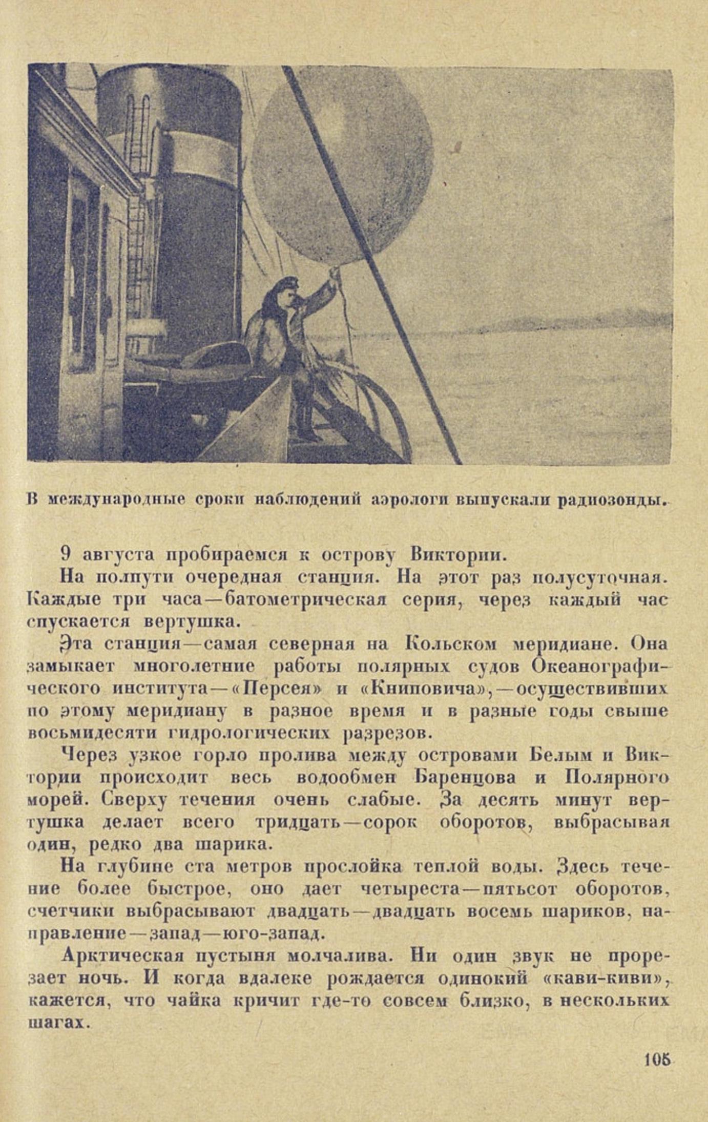 Через узкое горло пролива между островами Белым и Виктории происходит весь водообмен Баренцова и Полярного морей. Сверху течения очень слабые. За десять минут вертушка делает всего тридцать — сорок оборотов, выбрасывая один, редко два шарика.