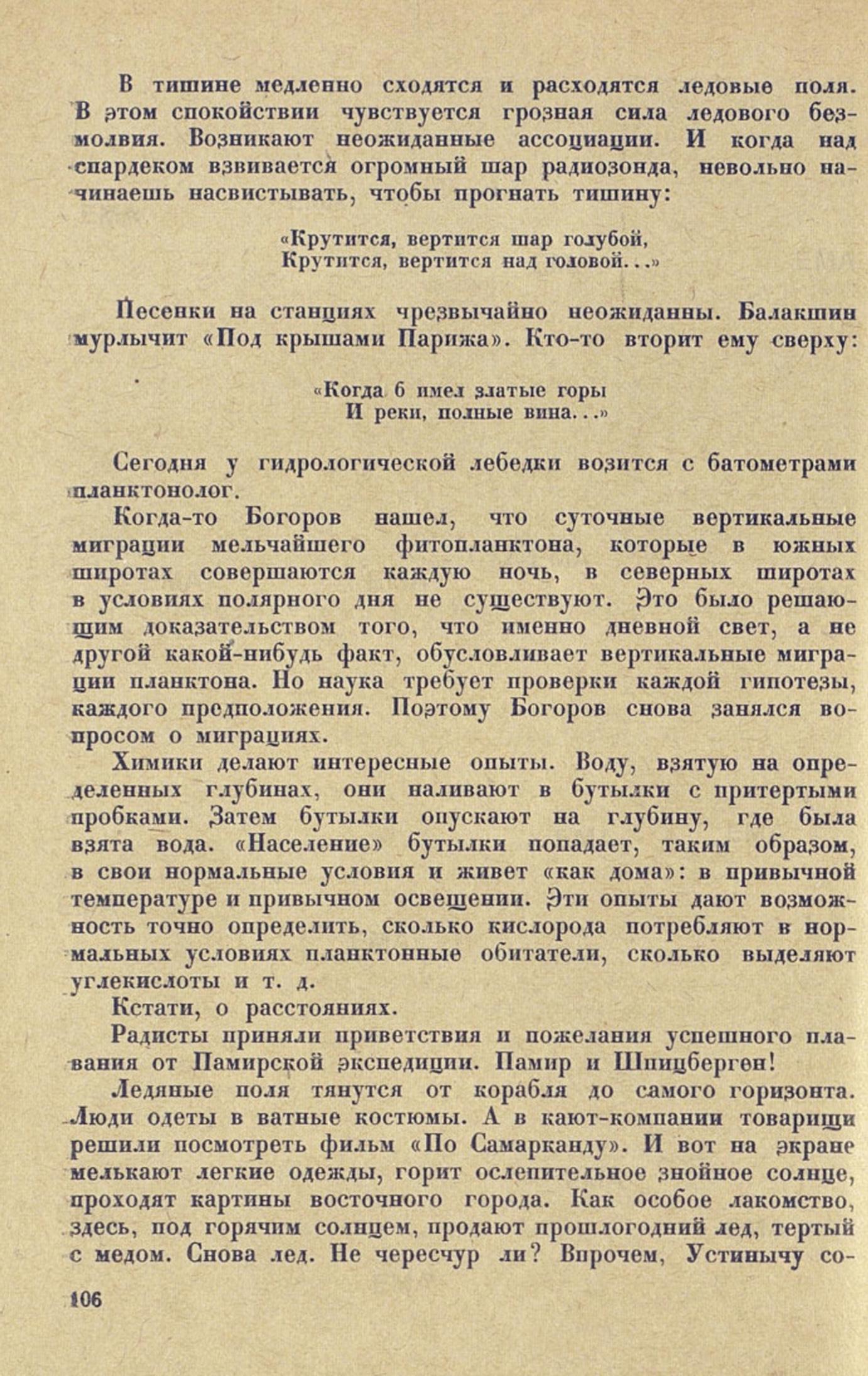 Ледяные поля тянутся от корабля до самого горизонта. Люди одеты в ватные костюмы. А в кают-компании товарищи решили посмотреть фильм «По Самарканду». И вот па экране мелькают легкие одежды, горит ослепительное знойное солнце, проходят картины восточного города. Как особое лакомство, здесь, под горячим солнцем, продают прошлогодний лед, тертый с медом. Снова лед. Не чересчур ли? Впрочем, Устинычу со-