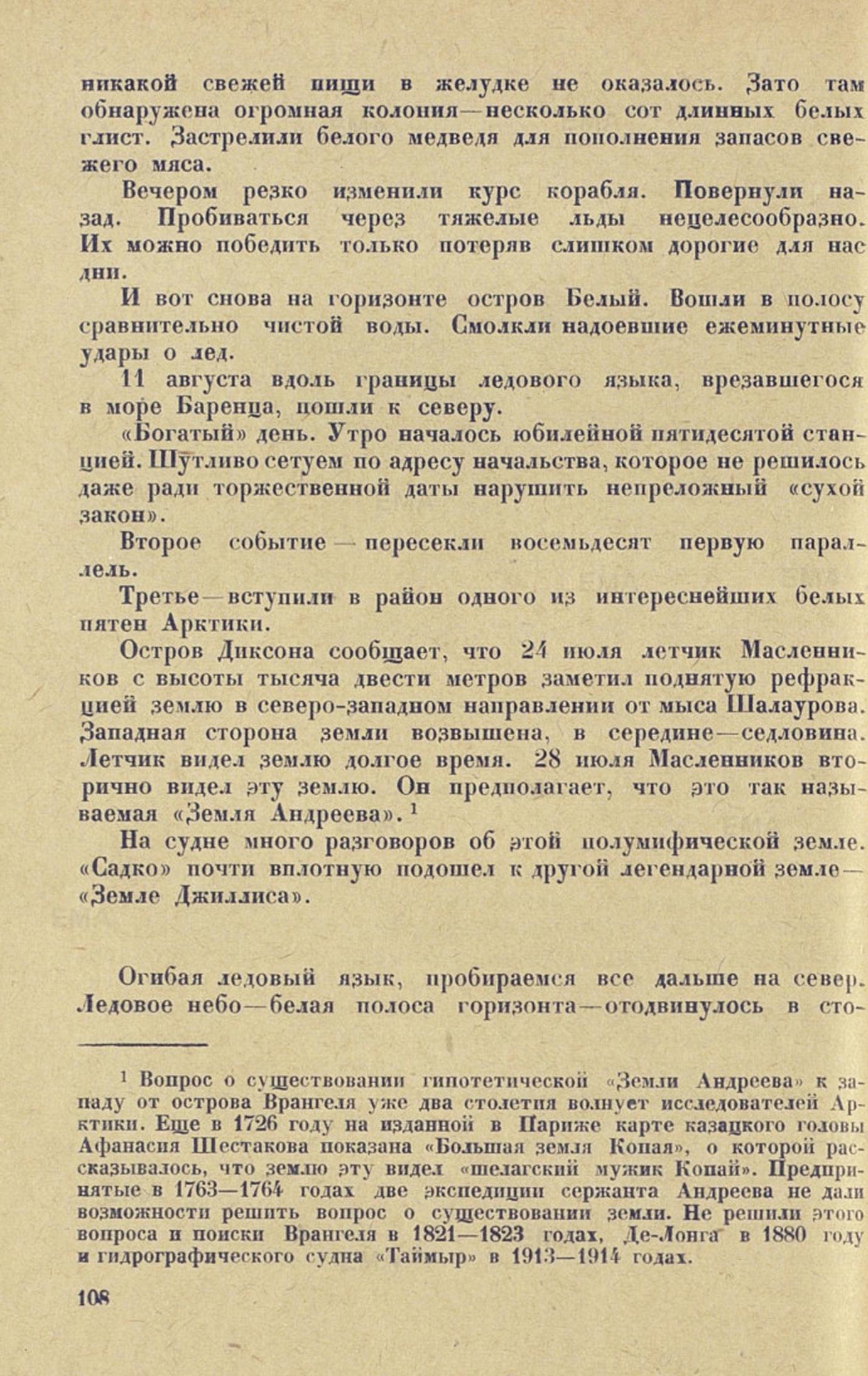 {1} Вопрос о существовании гипотетической «Земли Андреева» к западу от острова Врангеля уже два столетия волнует исследователей Арктики. Еще в 1726 году на изданной в Париже карте казацкого головы Афанасия Шестакова показана «Большая земля Копая», о которой рассказывалось, что землю эту видел «шелагский мужик Копай». Предпринятые в 1763—1764 годах две экспедиции сержанта Андреева не дали возможности решить вопрос о существовании земли. Не решили этого вопроса и поиски Врангеля в 1821—1823 годах, Де-Лонга в 1880 году и гидрографического судна «Таймыр» в 1913—1914 годах.[108]