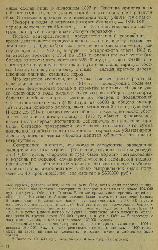 {28} Для большинства лет сведения имеются, и количества ввоза и вывоза устанавливаются точно; там, где сведения отсутствовали, взят максимум, который судно было в состоянии принять по дедвейту (грузоподъёмности). В годы, относительно которых не имеется прямых указании об уходе парохода порожнем и нет цифры вывоза, экспорт принят в размере, равном импорту или максимуму грузоподъёмности судов.{29} По официальной справке министерства торговли и промышленности, приведенной в работе Руднева и Кулика, в 1905 г. было ввезено 1.150.000 пудов (свыше 18.000 т). Эта цифра повторена В. Ю. Визе в «Истории исследования Советской Арктики». Это не так. С объявлением на 1905 г. порто-франко в устьях сибирских рек на такое количество было выдано разрешений на ввоз, но, как свидетельствует Востротин, лично участвовавший в операции, —- «Однако все попытки частных предпринимателей найти перевозочные средства по сибирским рекам Енисею и Оби потерпели неудачу: весь местный флот в том году был занят перевозкой казенных и частных грузов; удалось найти, и то на реке Оби, всего один пароход с двумя баржами для доставки иностранных товаров в количестве около 120.000 пудов от устья Оби до г. Томска. В то же время министерством путей сообщения в Германии и Англии спешно были закуплены для реки Енисея 6 пароходов и 9 железных барж грузоподъёмностью на 500.000 пуд. и из Гамбурга направлены в Енисей. Все эти речные пароходы и баржи с казенными грузами достигли осенью того же года до г. Енисейска. В 1905 г. в устье Енисея вошло 22 судна и привезено было казенных железнодорожных грузов около 600.000 пудов, а в устье Оби — 2 парохода с частными грузами, и количестве около 120.000 пудов».