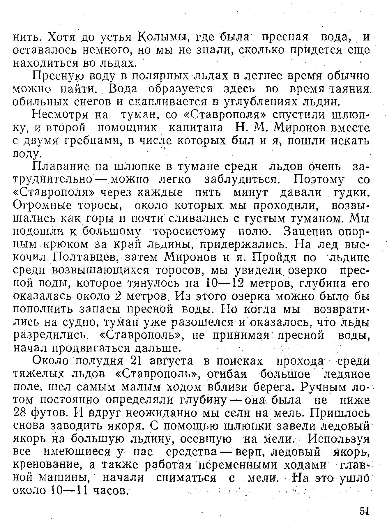 Около полудня 21 августа в поисках прохода - среди тяжелых льдов «Ставрополь», огибая большое ледяное поле, шел самым малым ходом вблизи берега. Ручным лотом постоянно определяли глубину — она была не ниже 28 футов. И вдруг неожиданно мы сели на мель. Пришлось снова заводить якоря. С помощью шлюпки завели ледовый якорь на большую льдину, осевшую на мели. Используя все имеющиеся у нас средства — верп, ледовый якорь, кренование, а также работая переменными ходами главной машины, начали сниматься с мели. На это ушло около 10—11 часов.