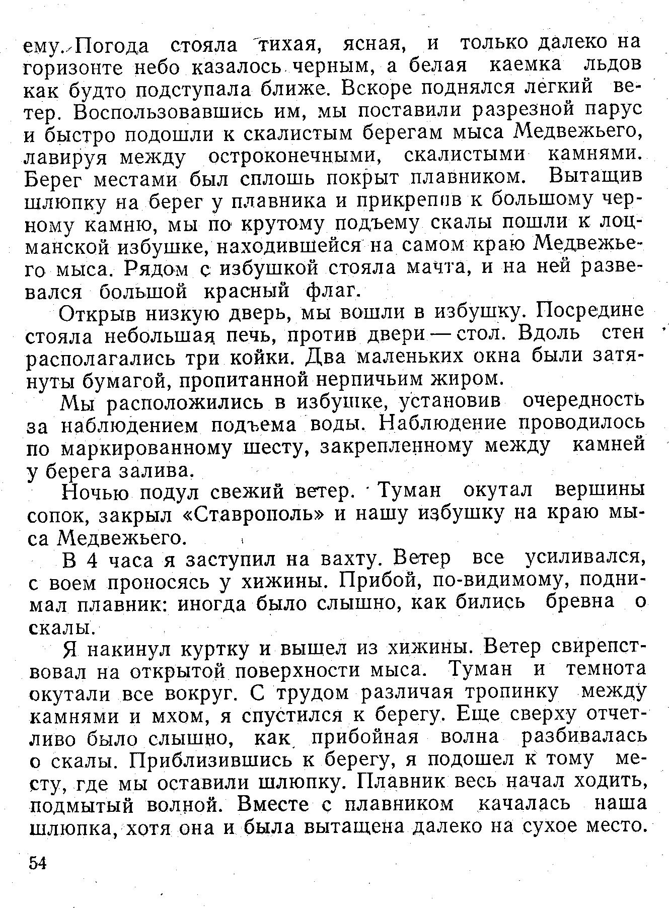 ему. Погода стояла тихая, ясная, и только далеко на горизонте небо казалось черным, а белая каемка льдов как будто подступала ближе. Вскоре поднялся легкий ветер. Воспользовавшись им, мы поставили разрезной парус и быстро подошли к скалистым берегам мыса Медвежьего, лавируя между остроконечными, скалистыми камнями. Берег местами был сплошь покрыт плавником. Вытащив шлюпку на берег у плавника и прикрепив к большому черному камню, мы по крутому подъему скалы пошли к лоцманской избушке, находившейся на самом краю Медвежьего мыса. Рядом с избушкой стояла мачта, и на ней развевался большой красный флаг.