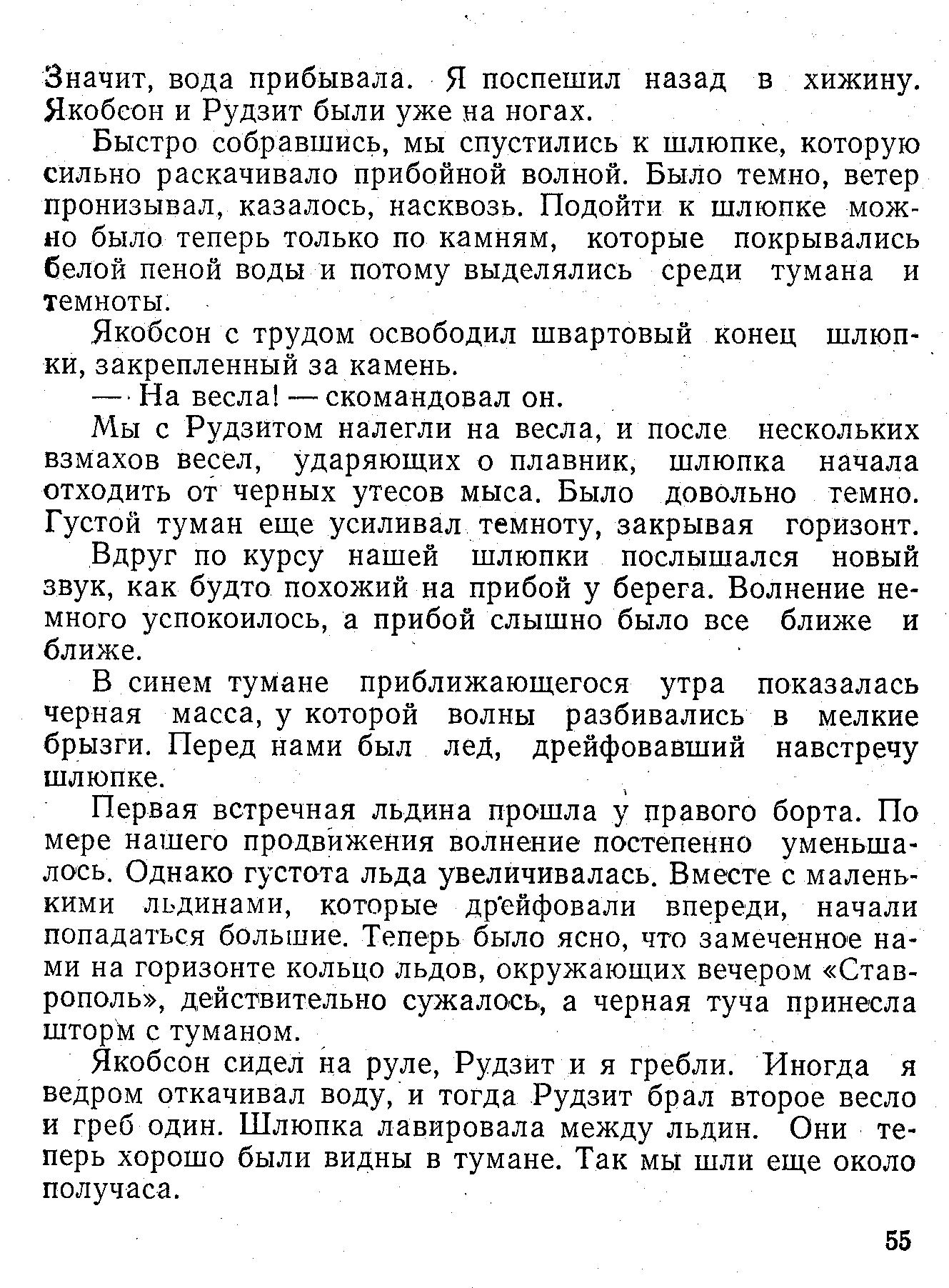 Якобсон сидел на руле, Рудзит и я гребли. Иногда я ведром откачивал воду, и тогда Рудзит брал второе весло и греб один. Шлюпка лавировала между льдин. Они теперь хорошо были видны в тумане. Так мы шли еще около получаса.