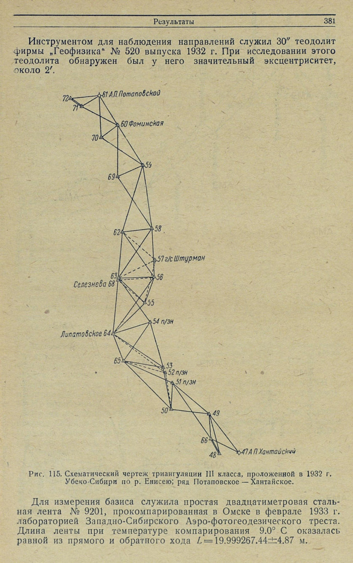 Рис. 115. Схематический чертеж триангуляции III класса, проложенной в 1932 г. Убеко-Сибири по р. Енисею; ряд Потаповское — Хантайское.Для измерения базиса служила простая двадцатиметровая стальная лента № 9201, прокомпарированная в Омске в феврале 1933 г. лабораторией Западно-Сибирского Аэро-фотогеодезического треста. Длина ленты при температуре компарирования 9.0° С оказалась равной из прямого и обратного хода L = 19.999267.44 ± 4.87 м.