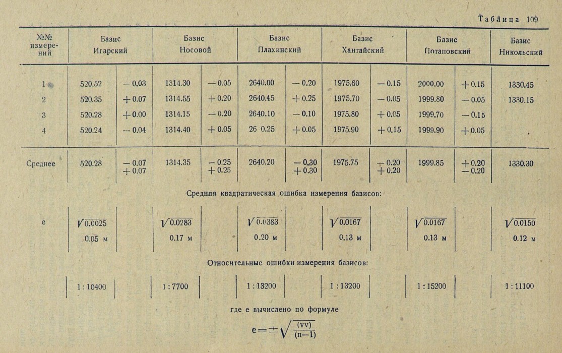Результаты четырехкратных измерений базисов сведены в таблице 109.