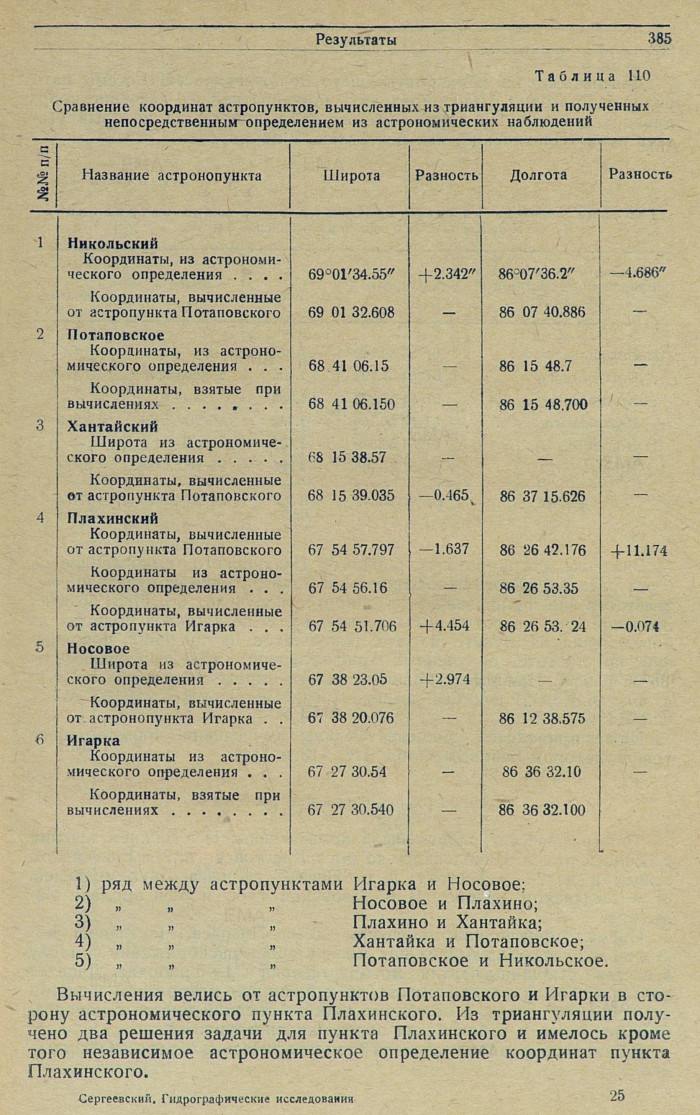 Кроме координат указанных астрономических пунктов, при уравновешивании ряда были использованы широты астрономических пунктов Носовое, Хантайское и Никольское, определенные Воробьевым в 1930 г. (см. рис. 113, 114, 115, 116, 117 и 118).