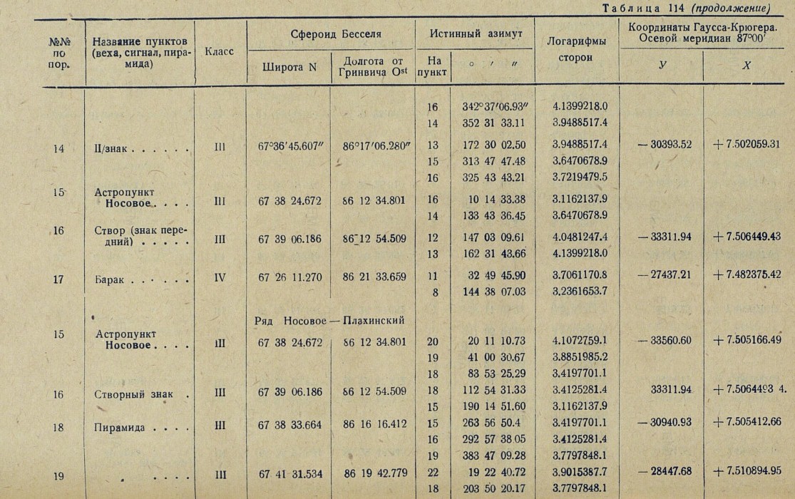 Обработка. В качестве основных пунктов, в проложенную вдоль р. Енисея триангуляционную сеть, вошли три астрономических пункта: астропункт Игарка, определенный астрономом Убеко-Сибири С. Г. Карандашевым в 1931 г., и астропункты Плахинское и Потаповское, определенные астрономом В. И. Воробьевым в 1930 г.