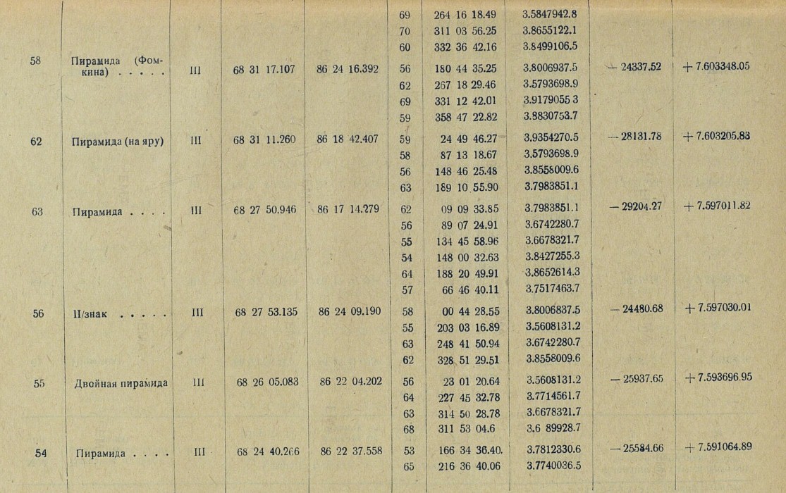 68 Пирамида Селезнева.... IV 68 27 43.288 86 17 05.960 55 131 48 27.26 3.6589928.7 -29301.27 +7.596776.26