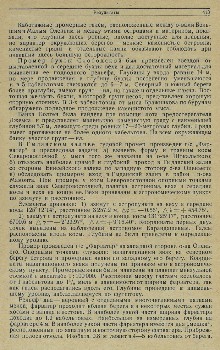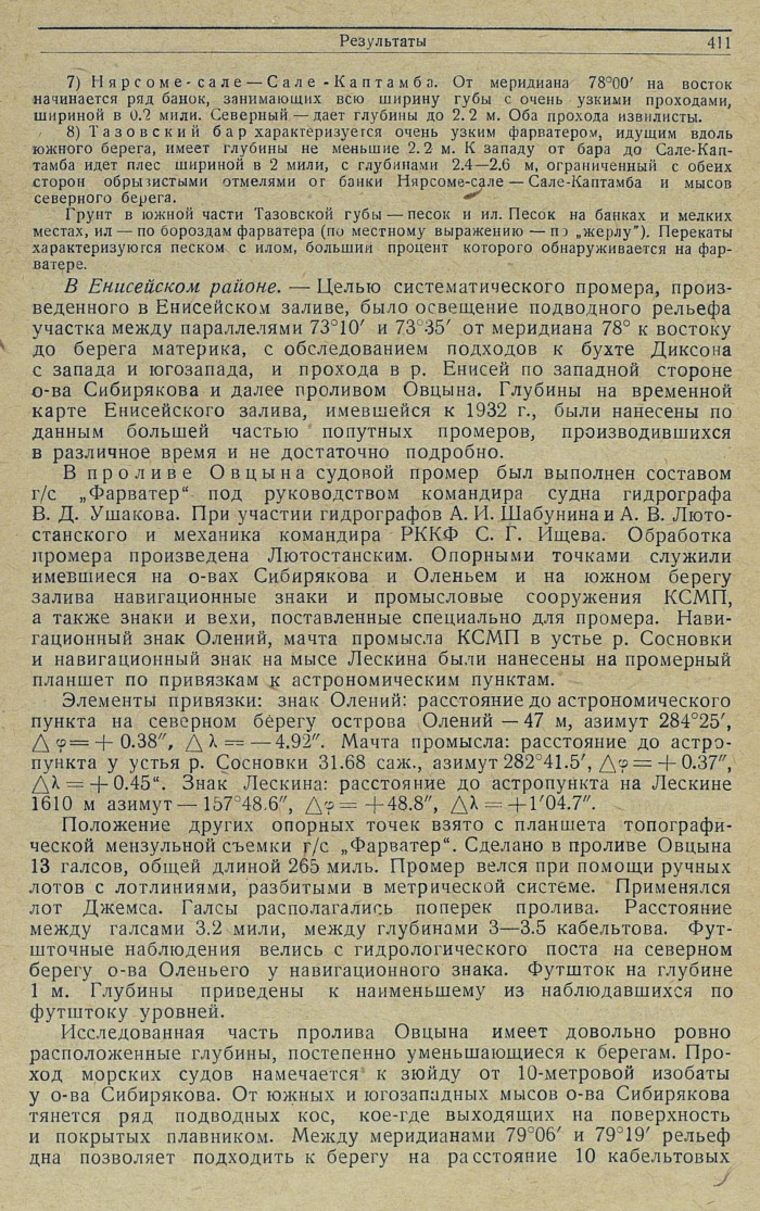 Промерные работыСудовой промер производился: в западной половине пролива Малыгина, в Тазовской губе, в Енисейском заливе, к северу, западу и югу (в проливе Овцына) от о-ва Сибирякова, у северного и западного берегов о-ва Оленьего, в средней части Гыданского залива, в р. Енисее от мыса Крестовского до сел. Никольского; обследованы промером бухта Слободская и бухта у мыса Сопочной Корги в Енисейском заливе. {1}