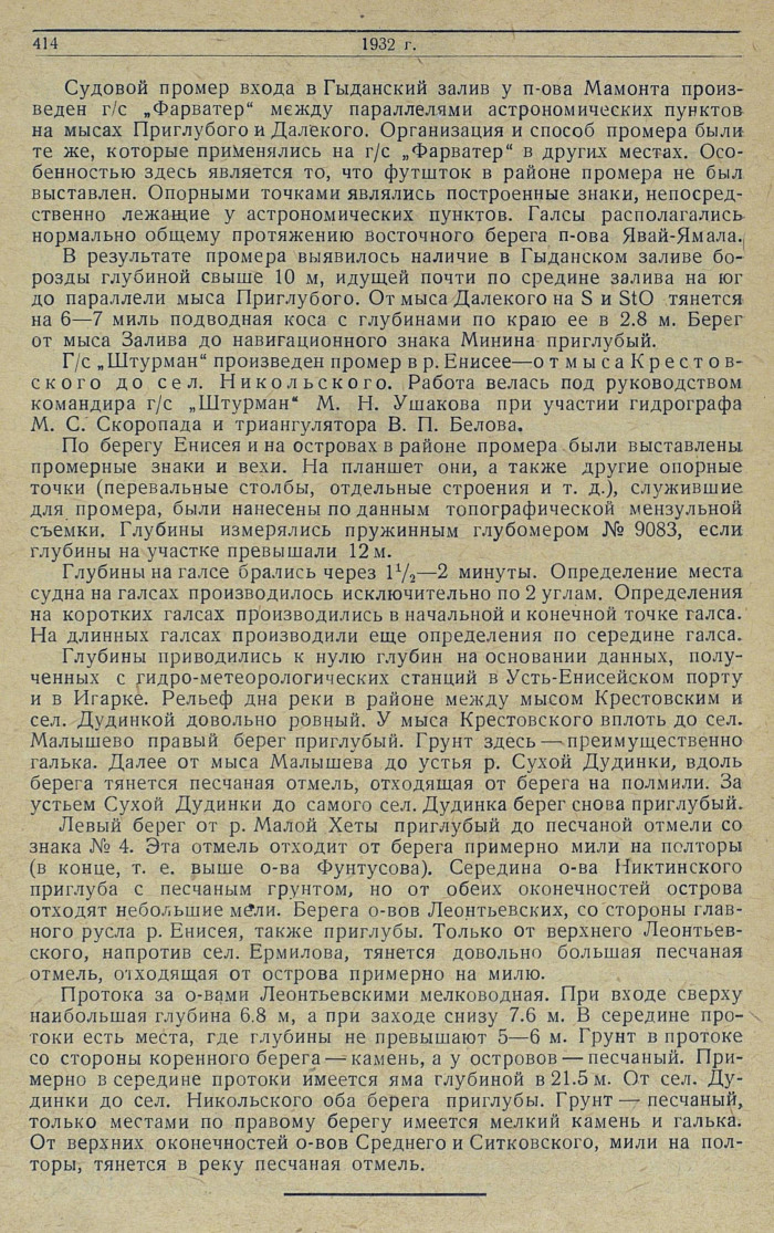 Г/с „ Штурман" произведен промер в р. Енисее — от мыса Крестовского до сел. Никольского. Работа велась под руководством командира г/с „Штурман" М. Н. Ушакова при участии гидрографа М. С. Скоропада и триангулятора В. П. Белова.