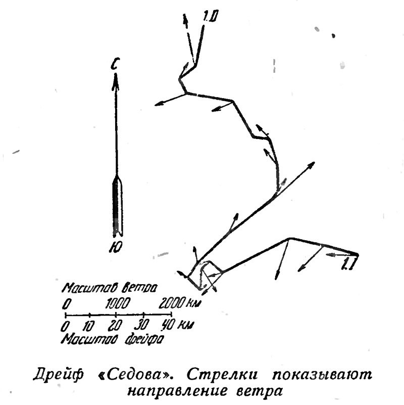 На нашем рисунке (см. стр. 19) изображен дрейф «Седова» с 1 января по 1 февраля 1939 г., а рядом показаны стрелками соответствующее направление и относительная сила ветра между отдельными отрезками дрейфа. Масштаб скорости дрейфа и скорости ветра принят согласно второму правилу Нансена (т. е. скорость дрейфа в 50 раз меньше скорости ветра). Из рисунка видно, насколько хорошо оба правила Нансена подтверждаются дрейфом «Седова». При каждом изменении ветра немедленно изменяется в соответствующую сторону и направление дрейфа «Седова». Неудивительно поэтому, что дрейф «Седова», подобно всем предыдущим дрейфам со льдами, не проходит и не будет проходить прямолинейно. «Седов» то идет в одном направлении, то возвращается обратно, то описывает причудливые петли* и зигзаги, и все это связано с соответствующими изменениями в направлении и скорости ветра. Если в некоторых точках дрейфа и получаются некоторые расхождения с правилами Нансена, то это надо скорее объяснить неточностью наблюдений, вернее, неполнотой дошедших до нас сведений, чем существом дела.