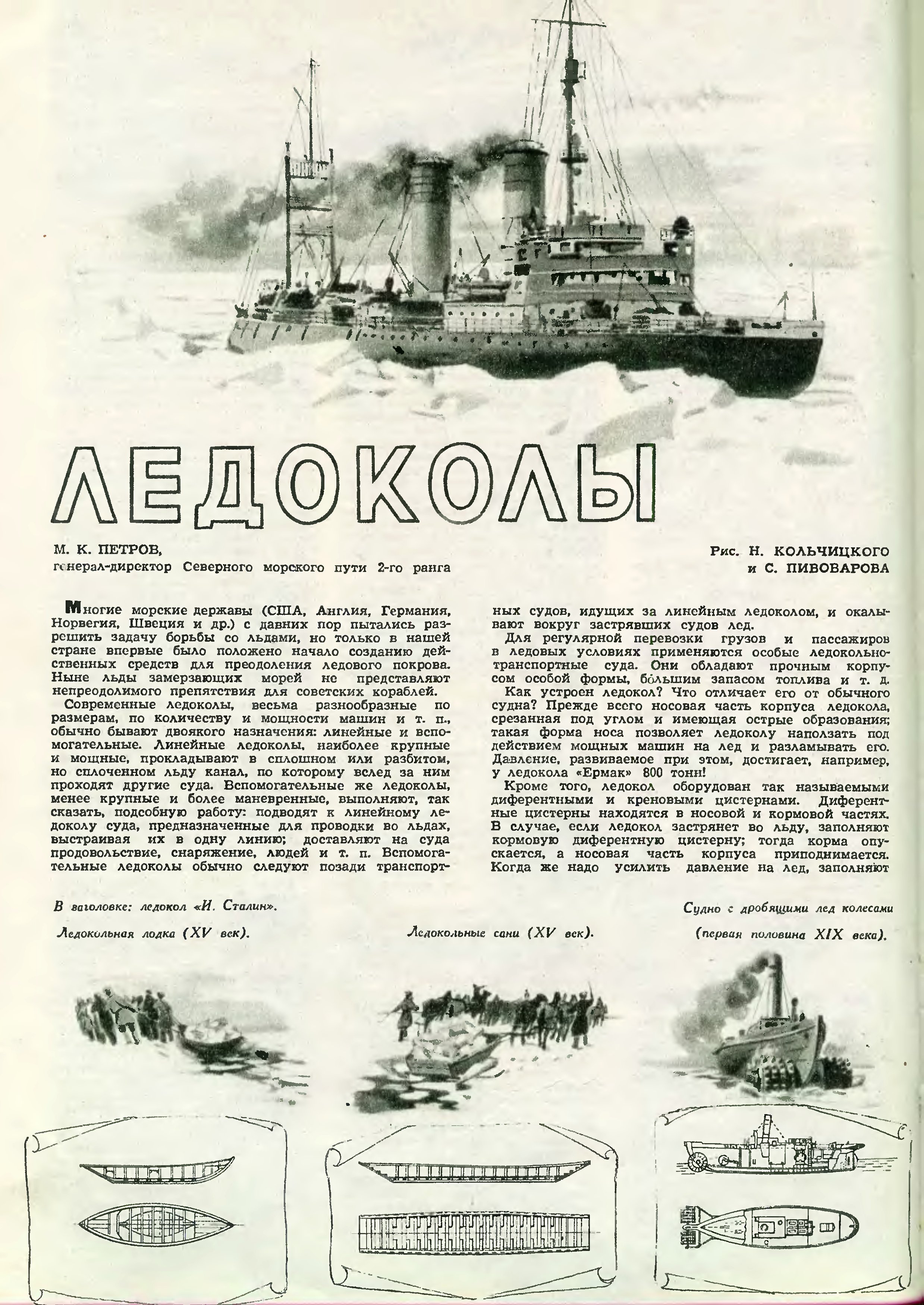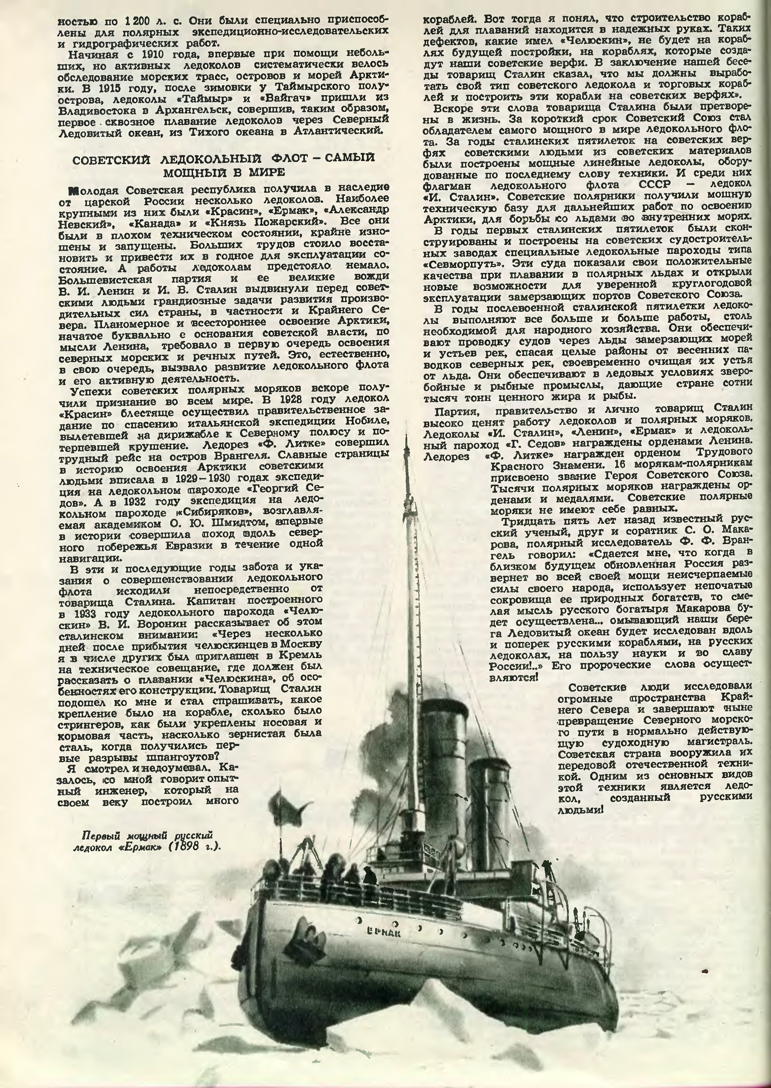 Советские люди исследовали огромные (пространства Крайнего Севера и завершают ныне превращение Северного морского пути в нормально действующую судоходную магистраль. Советская страна вооружила их передовой отечественной техникой. Одним из основных видов этой техники является ледокол, созданный русскими людьми!