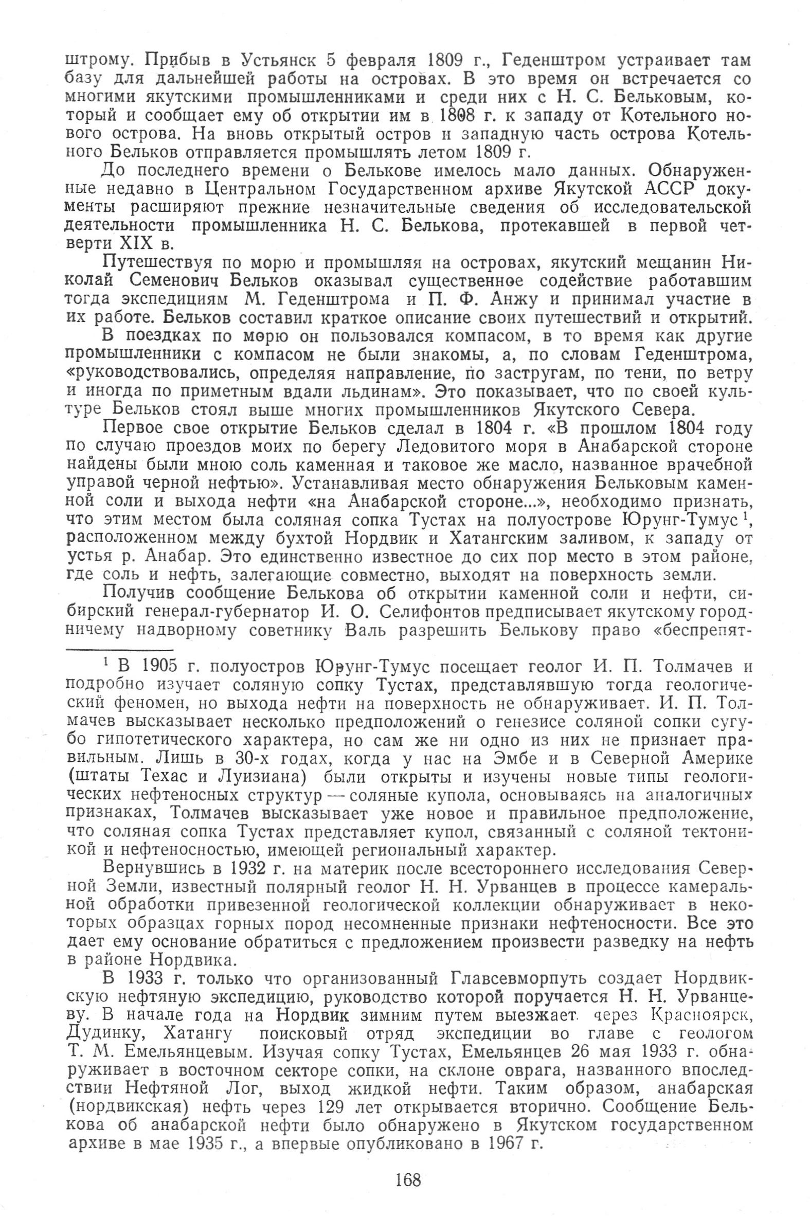 Первое свое открытие Бельков сделал в 1804 г. «В прошлом 1804 году по случаю проездов моих по берегу Ледовитого моря в Анабарской стороне найдены были мною соль каменная и таковое же масло, названное врачебной управой черной нефтью». Устанавливая место обнаружения Бельковым каменной соли и выхода нефти «на Анабарской стороне... », необходимо признать, что этим местом была соляная сопка Тустах на полуострове Юрунг-Тумус {1}, расположенном между бухтой Нордвик и Хатангский заливом, к западу от устья р. Анабар. Это единственно известное до сих пор место в этом районе, где соль и нефть, залегающие совместно, выходят на поверхность земли.