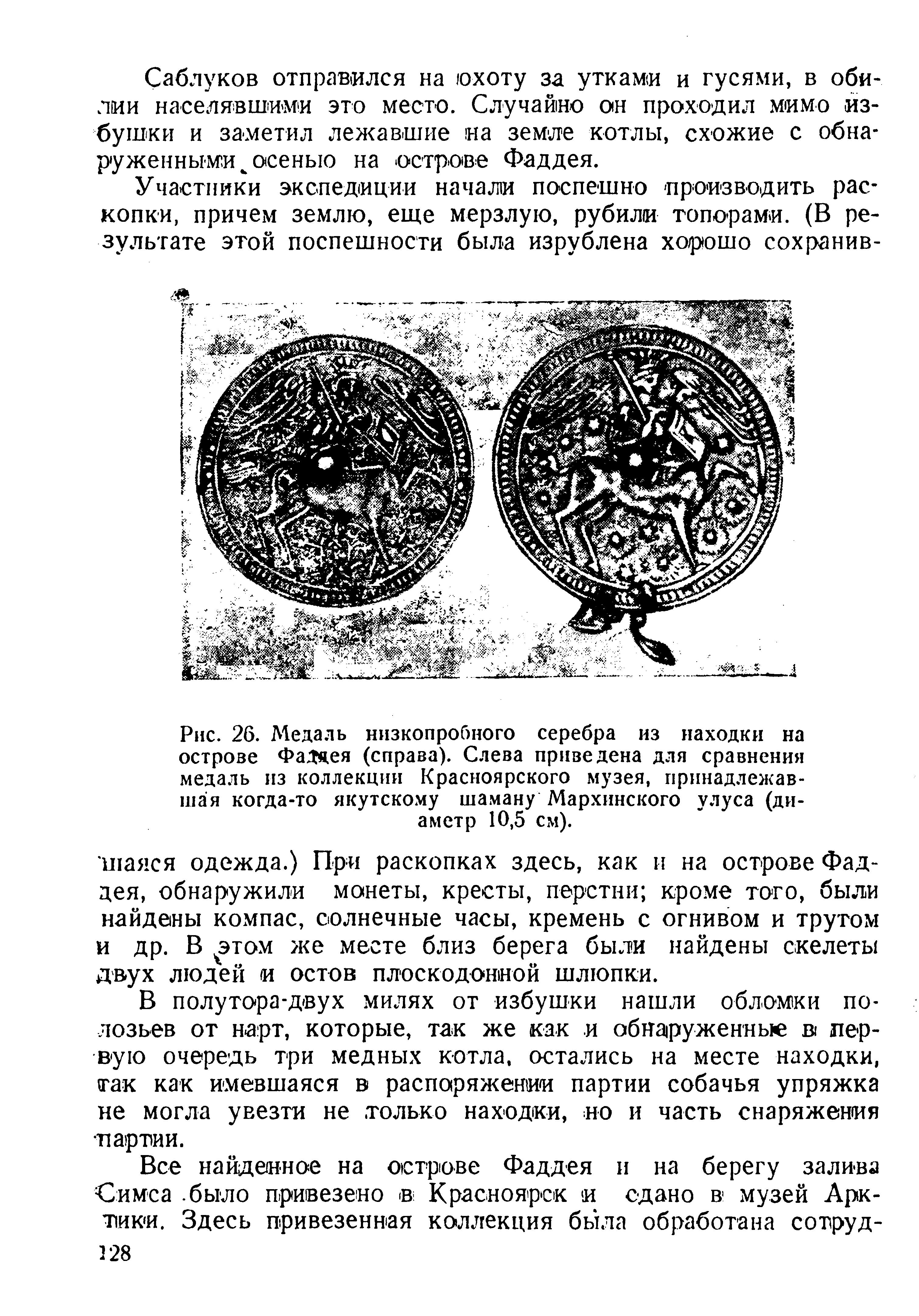 Рис. 26. Медаль низкопробного серебра из находки на острове Фаддея (справа). Слева приведена для сравнения медаль из коллекции Красноярского музея, принадлежавшая когда-то якутскому шаману Мархинского улуса (диаметр 10,5 см).