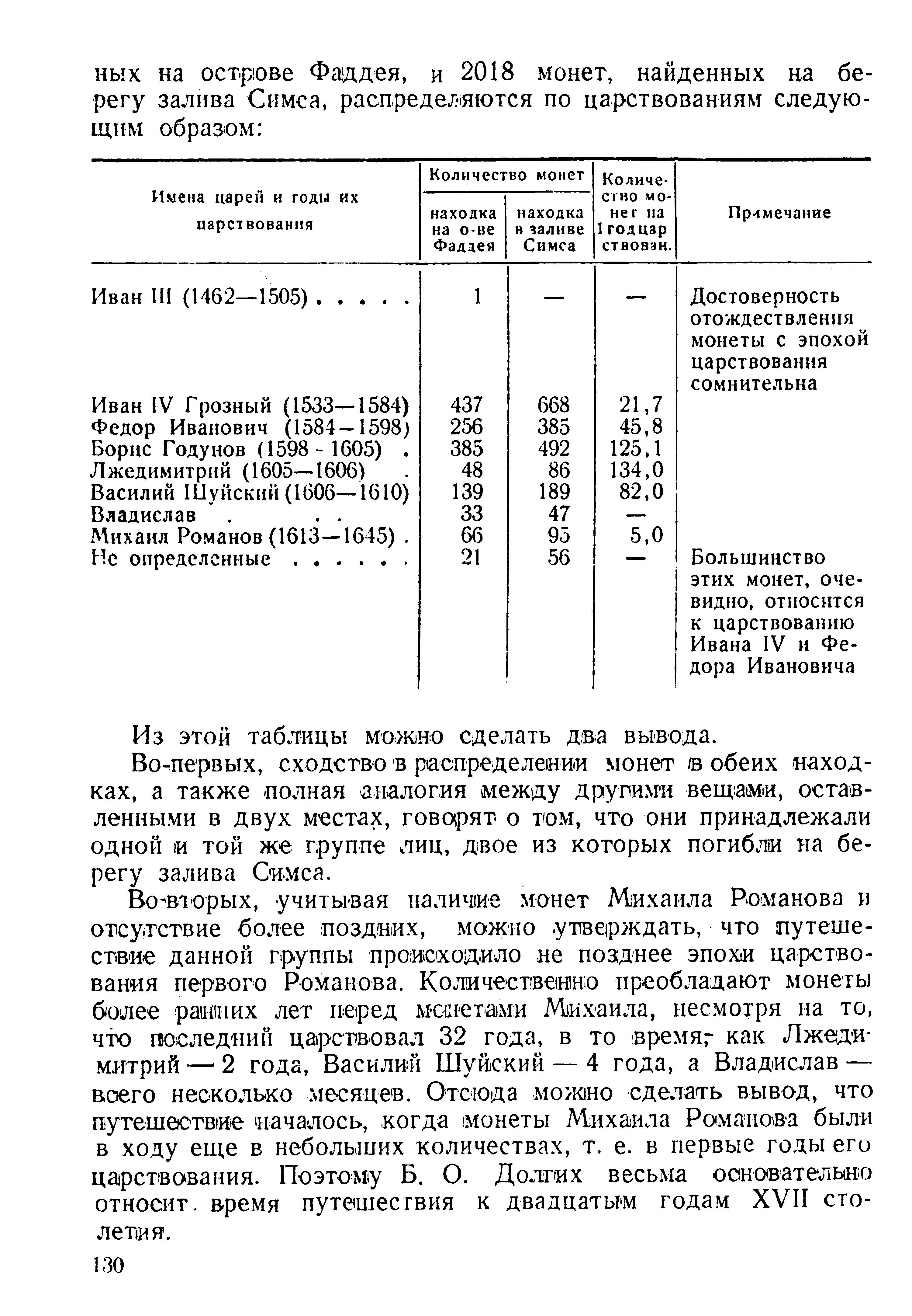При обнаружении обеих находок нас больше всего интересовал вопрос, к какому времени относится посещение Восточно-Таймырского побережья русскими людьми, владельцами оставленных вещей. Отсутствие дневников и вообще каких-либо документов не давало возможности получить прямой ответ на этот вопрос. Косвенное разрешение его было получено при изучении всех найденных монет и распределении их по годам. Оказывается, что 1386 монет, найден-